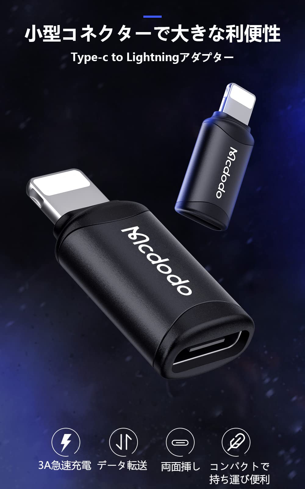 【3A急速充電】:最大3Aの電流に対応し、デバイスを急速充電できます。【スマホを傷つけず、より安定した充電を実現】:抵抗センサー内蔵、インテリジェントな電流マッチングで、より安全な充電。【スムーズな抜き差し、耐久性】:加工精度が高く、スムーズなインターフェースとスムーズな抜き差しで、スマホを傷つけません。10,000回の厳しい挿抜試験に合格。※上記データはMcdodoの試験に基づきます。※本製品はAtoCケーブルを接続する場合でiPadへの充電を対応しません。※本製品は、USBメモリ、SSD、アップルペンシル、多機能ケーブル間の変換を対応しません。