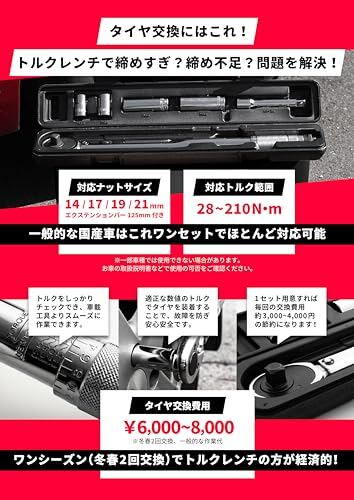 セット内容:トルクレンチ本体、ショートソケット(14mm・17mm)、ロングソケット(19mm・21mm)、エクステンションバー125mm