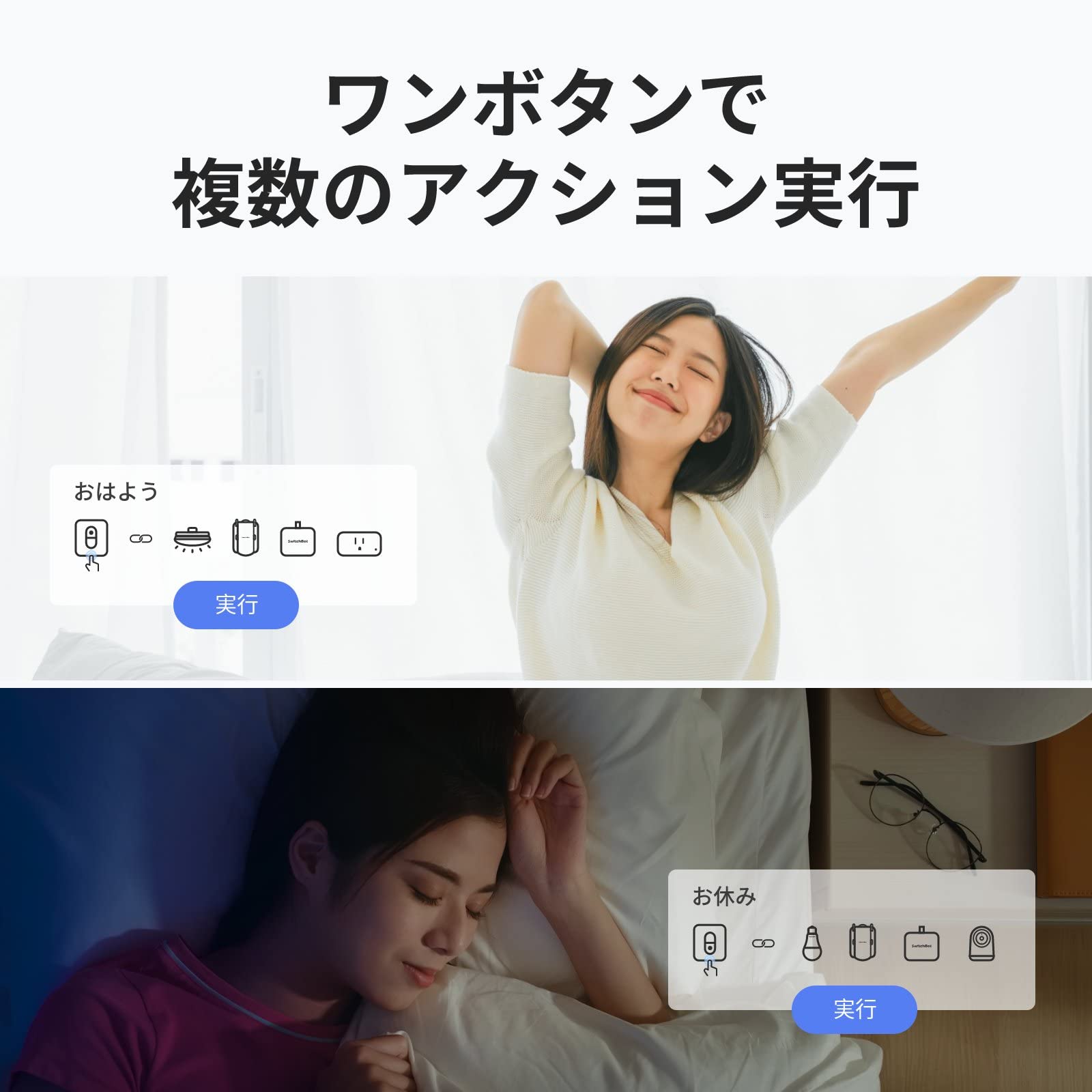 【ワンタッチで複数のデバイスをコントロール】ボタン2つあり、それぞれのボタンのアクションを設定することができます。1つのボタンで単一のSwitchBotデバイスの特定のアクションを実行することができます。または、1つのボタンで1つのシーン(手動実行)を実行し、複数のSwitchBotデバイスを同時に操作することもできます。例えば、凹型ボタンでSwitchBotカーテンの開閉を操作します。凸型ボタンでSwitchBot製品と連携したご自宅の家電を一括操作することもできます。あらかじめシーン(手動実行)を設定すれば、複数のSwitchBotデバイスのアクションを実行できます。