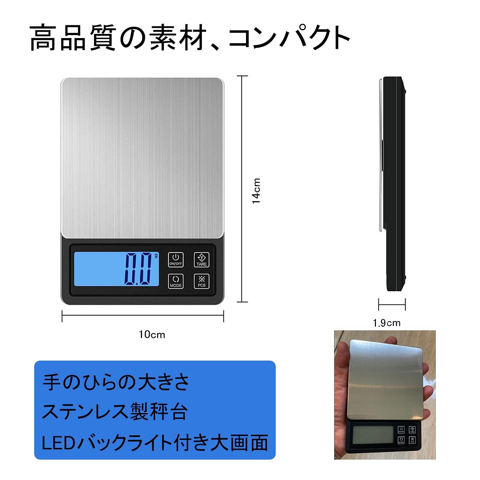 【コンパクト、高品質】ステンレス秤台、耐久、清潔に便利。本体サイズ140×100×19mm、重量約310g。超薄型設計を採用しているので、場所を取らずに収納や持ち運びもラクラクです。同梱物:スケール本体大小透明カバー(計量皿との併用可)*1、単4形乾電池*2、USB充電コード*1、日本語取扱説明書(保証書)*1。