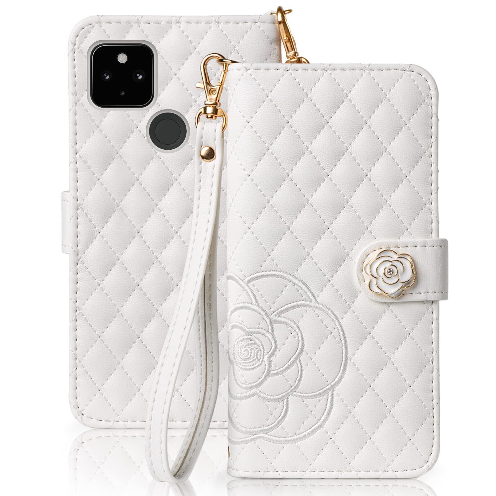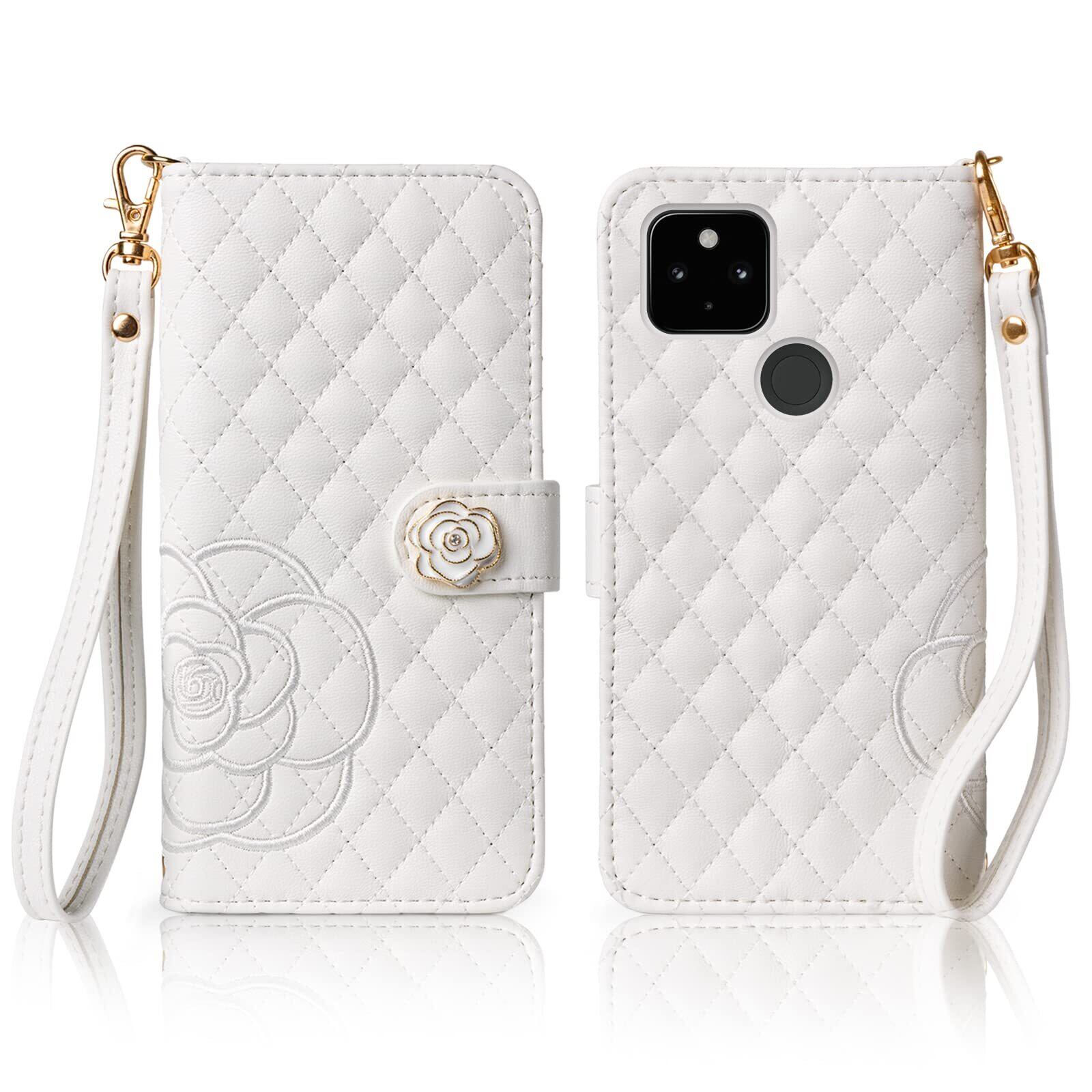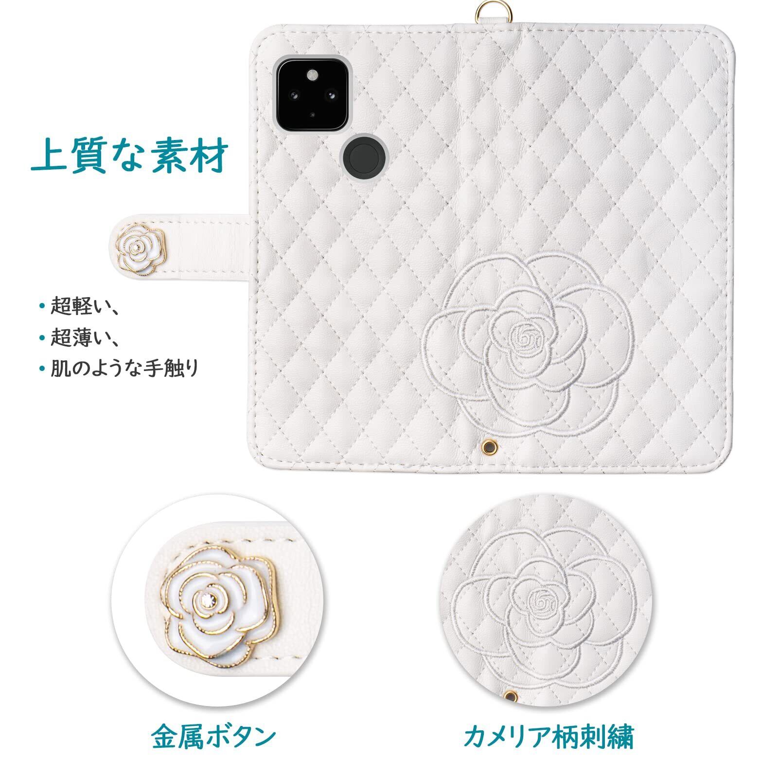 SZJAMIE Google Pixel 4a 5G ケース 手帳型 Pixel 4a 5G 手帳型ケース 薔薇刺繍 おしゃれ カメリア花柄 グーグル ピクセル 4a 5G スマホケース 女性向け 上品 高級レザー 軽量 可愛い 手触り 耐衝撃 カード収納 財布型 横置きスタンド機能 全面保護 ストラップホール付き (Google Pixel 4a 5G 対応, ホワイト)