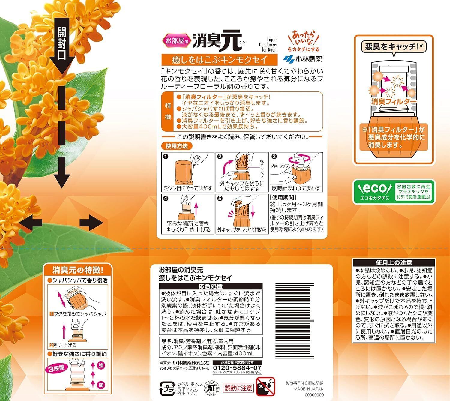 小林製薬 消臭元 まとめ買い お部屋の癒しをはこぶ キンモクセイ 消臭芳香剤 玄関 リビング 部屋用 400ml×3個