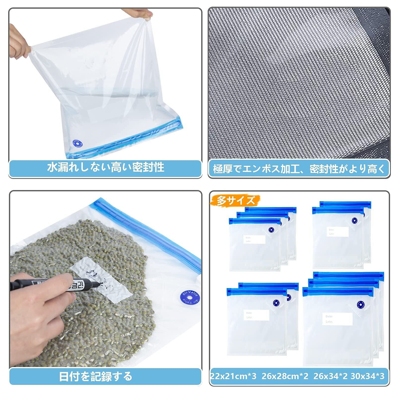 【セット内容】真空保存袋x10枚(サイズ:22*21 cm *3枚、26*28 cm *2枚 、26*34 cm *2枚 、30*34 cm*3枚)、手動ポンプx1 、密封用スライダーx4枚。*多機能食品保存バッグは、米、ナッツ、ビスケット、果物、野菜などの固形および半固形食品の保管に使用できます。フード&ホーム、アウトドアで利用できます。 また、ペットのおやつ用の抗菌保存バッグとして、或いは小物、雑誌、薬などを貯蔵するために使用することもできます。