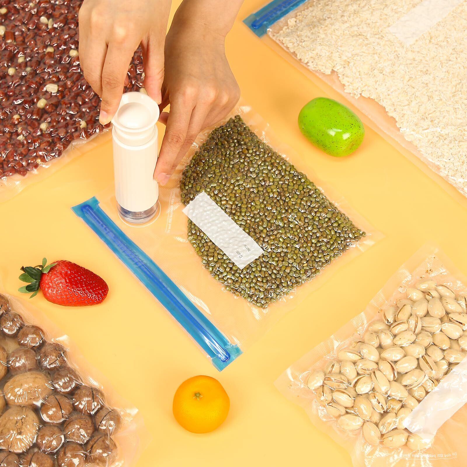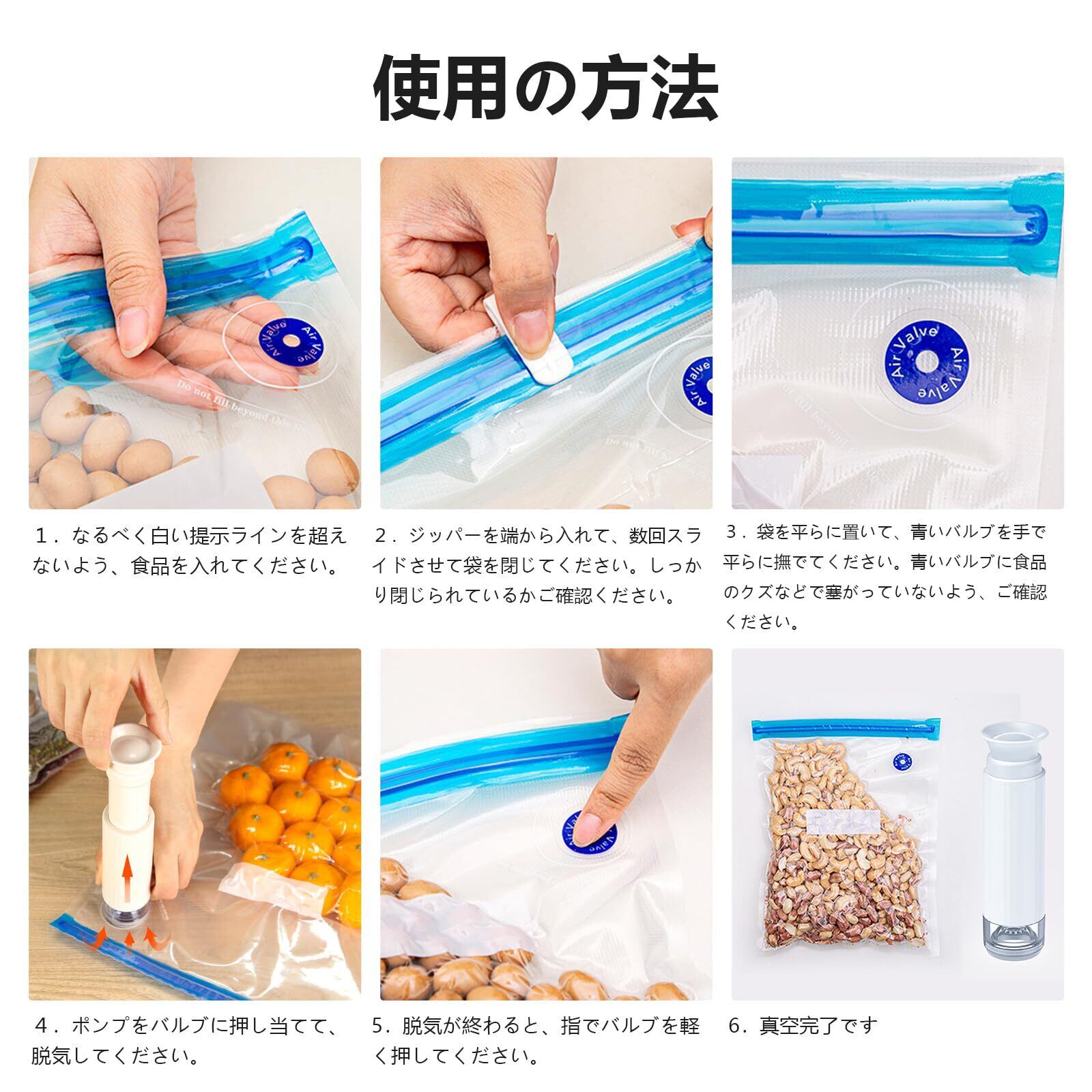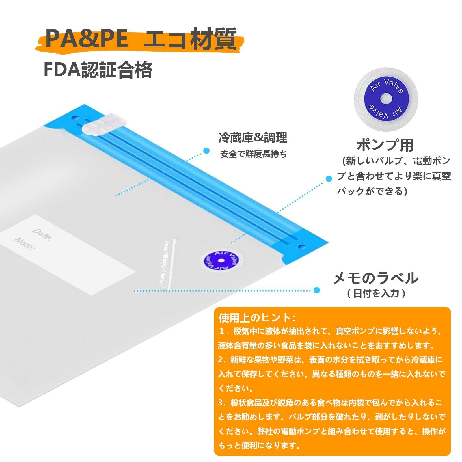 【注意事項】1.脱気中に液体が抽出されて、真空ポンプに影響しないよう、液体含有量の多い食品を袋に入れないことをおすすめします。2.新鮮な果物や野菜は、表面の水分を拭き取ってから冷蔵庫に入れて保存してください。異なる種類のものを一緒に入れないでください。3.粉状食品及び鋭角のある食べ物は内袋で包んでから入れることをお勧めします。バルブ部分を破れたり、剥がしたりしないでください。弊社の電動ポンプと組み合わせて使用すると、操作がもっと便利になります。