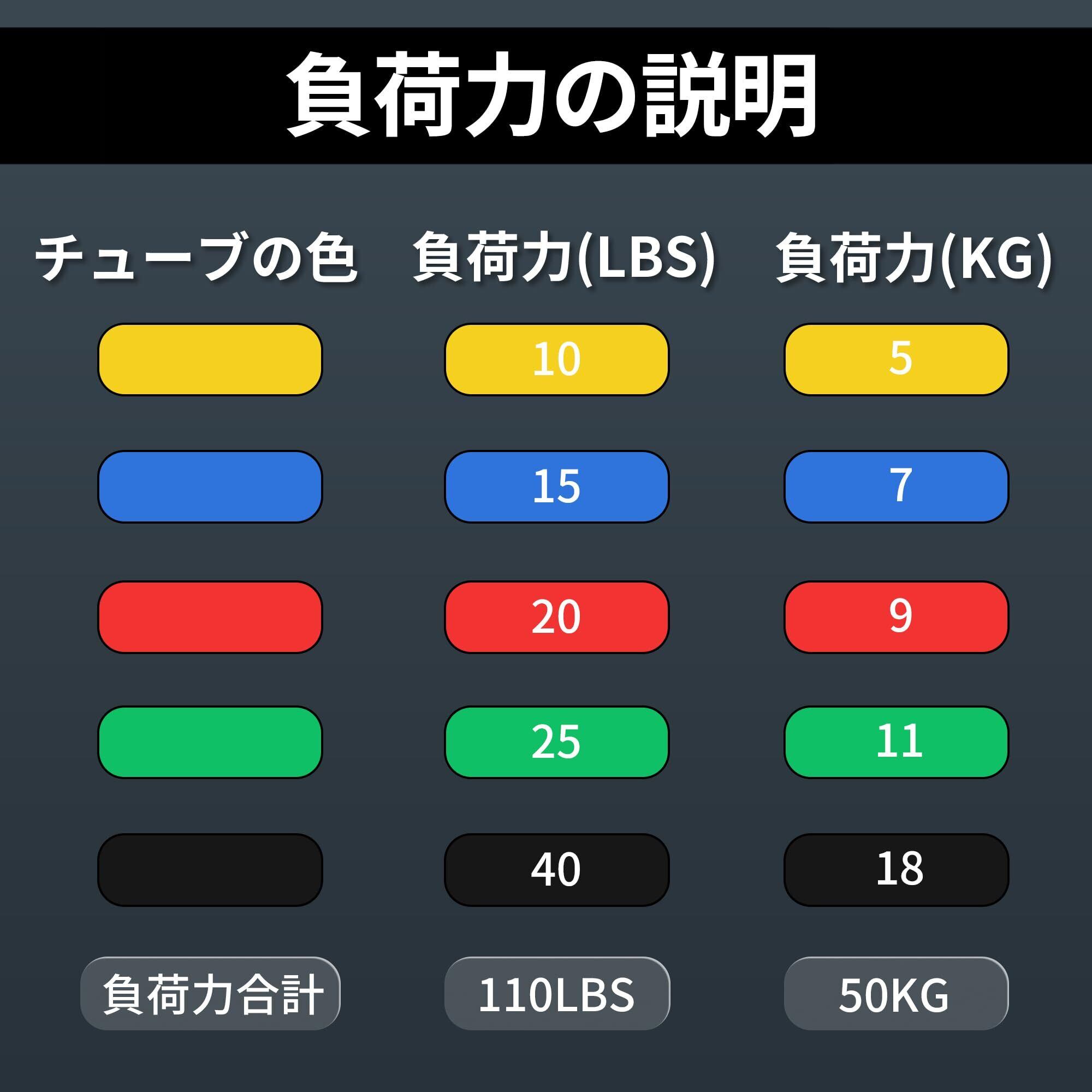 【50kgまでの負荷調整】:5本のチューブ合わせて50kg(110LBS)までの負荷調整が簡単にできます。ゴムは自在に伸縮し変化し運動のバリエーションを多く生み出すことができます。ゴムの負荷力を利用してトレーニングの効果をより高めるためにこの商品を開発しました。チューブを利用してそれぞれの用途によってトレーニングできます。