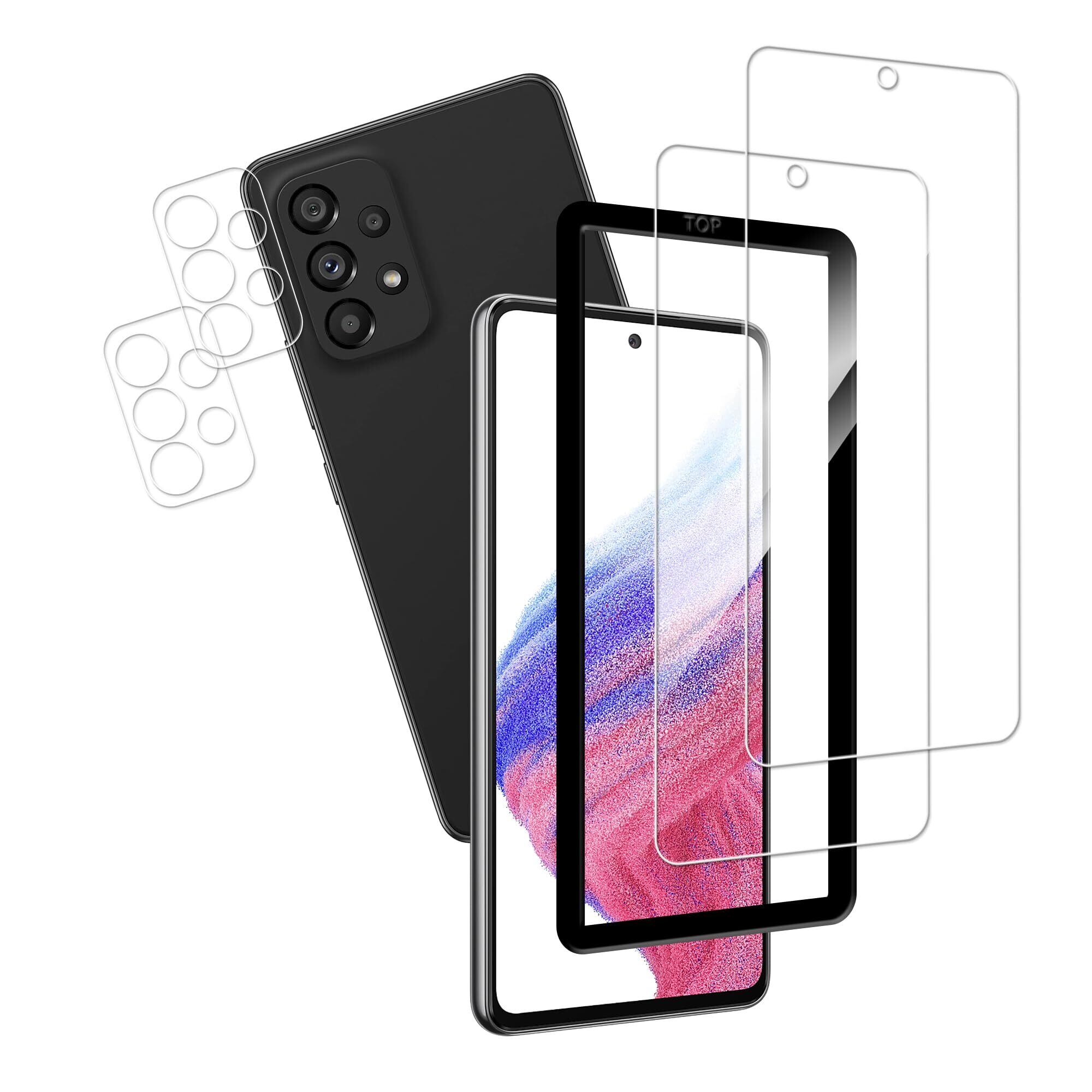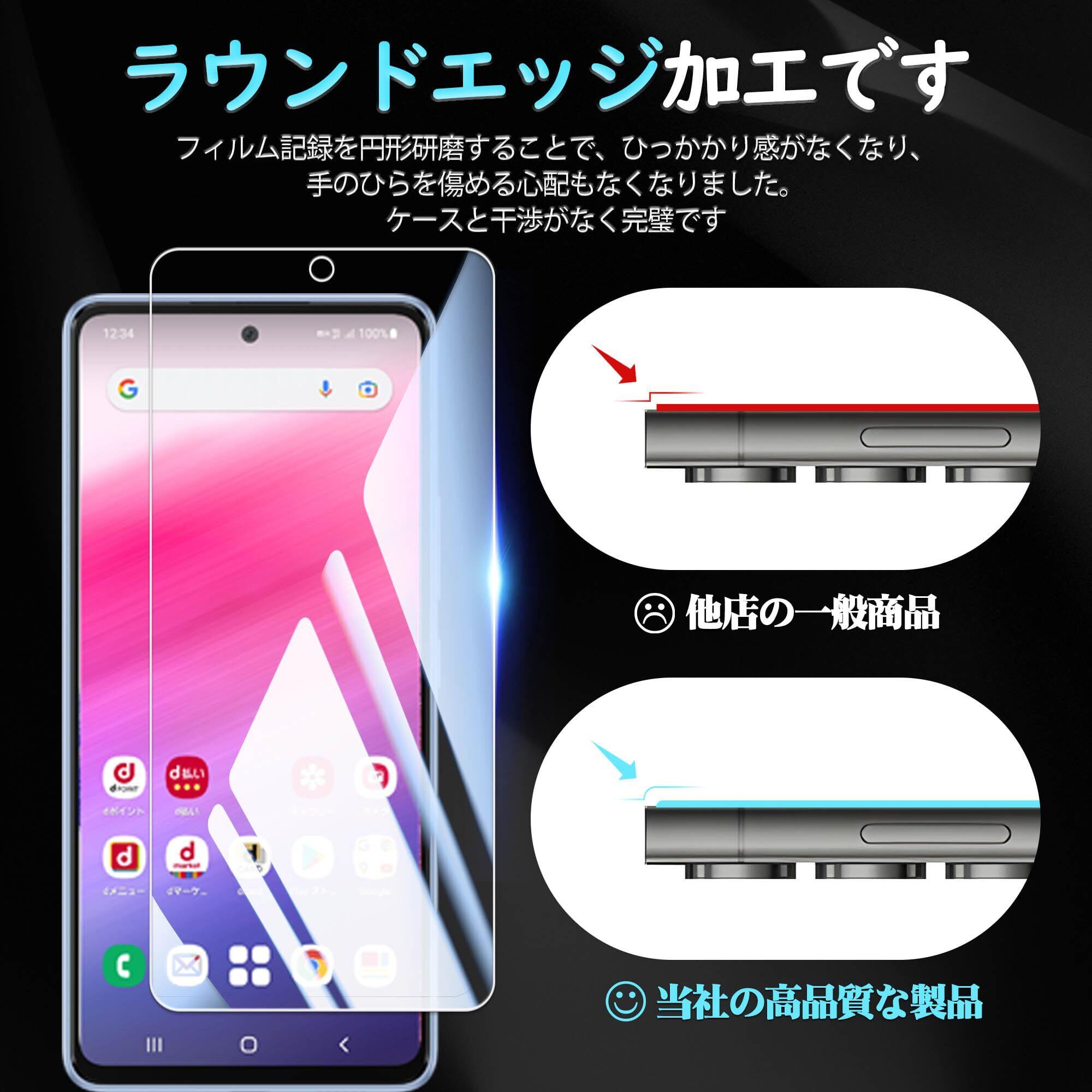 【対応機種】Galaxy A53 5G SC 53C SCG15 ガラスフィルム2枚 + カメラフィルム2枚。【注意】この電話の画面の端は湾曲しているため、保護フィルムのサイズが丁度良い場合、しっかりと貼り付けられず、白いエッジやシェルとの干渉などの問題があるため、保護フィルムは画面よりも小さいです。
