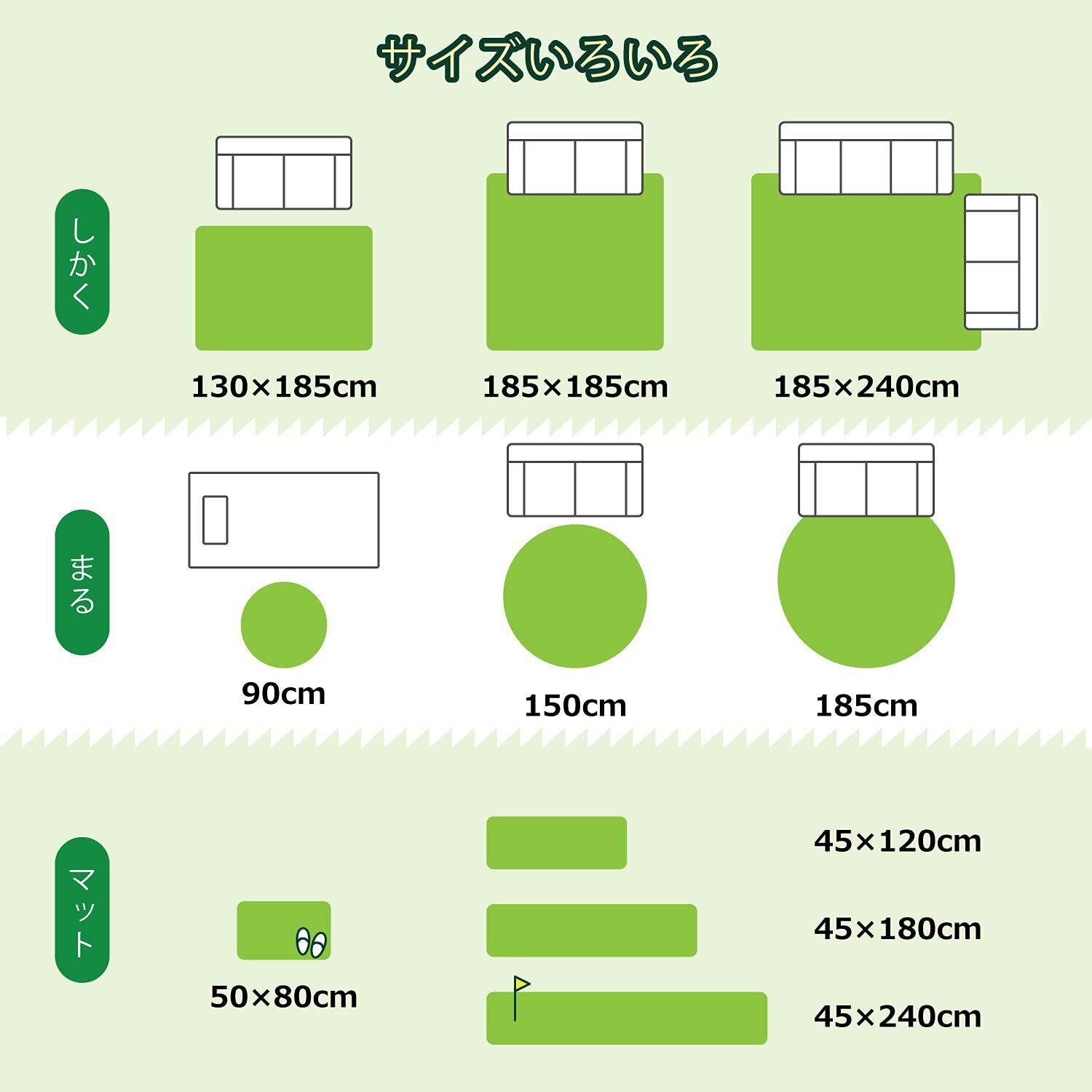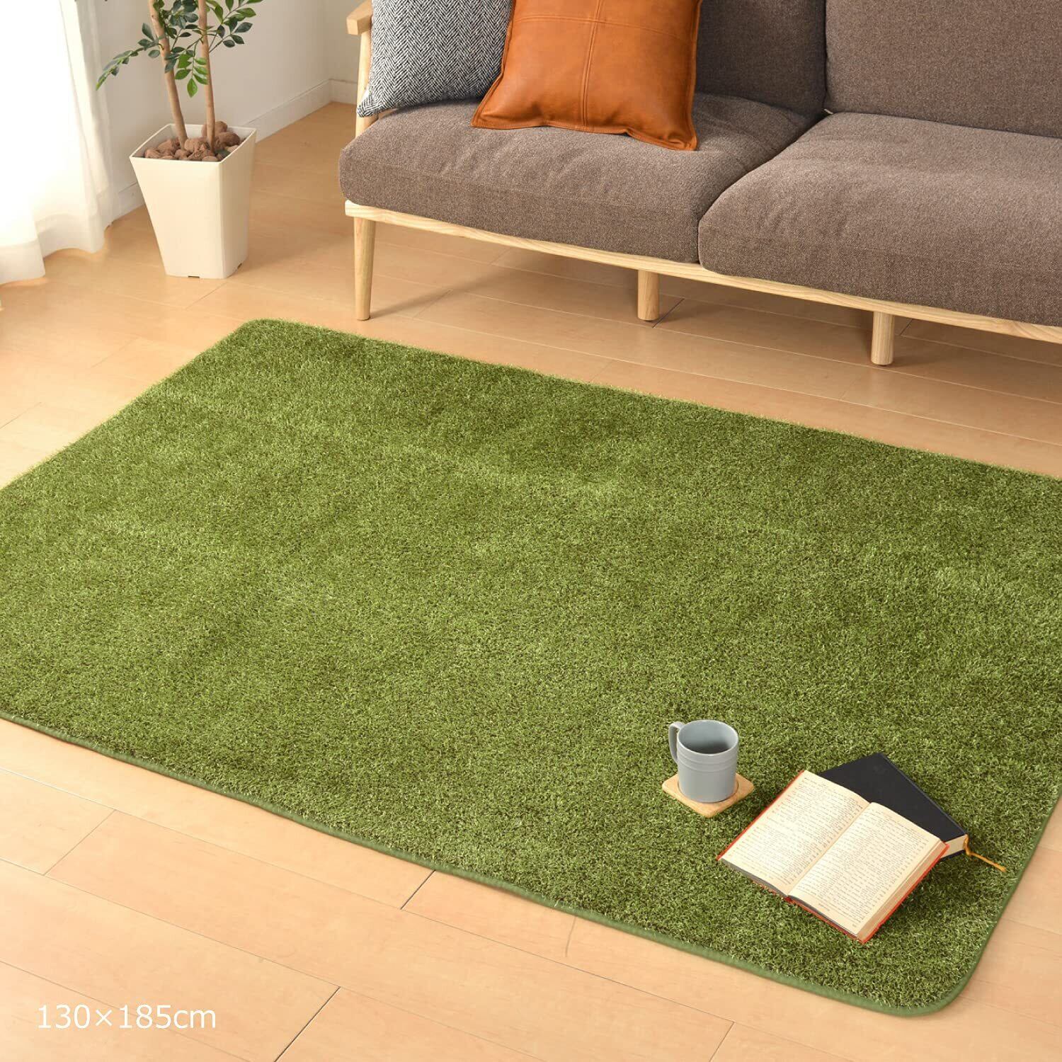 室内のお部屋にいながら、アウトドア気分を味わえる芝生風ラグです。遠目から見るとまるでキレイめな芝生に見えてしまうその秘密は糸にあります。光沢のある長い黄緑のねじれ糸や太めの茶&緑糸を使用することで本物にちかい雰囲気を表現しています。観葉植物をたくさん置いて、緑いっぱいの素敵な空間を作ったり、子供のスポーツコーナーやお父さんのゴルフスイングスペースなど…楽しい使い方がいっぱい!