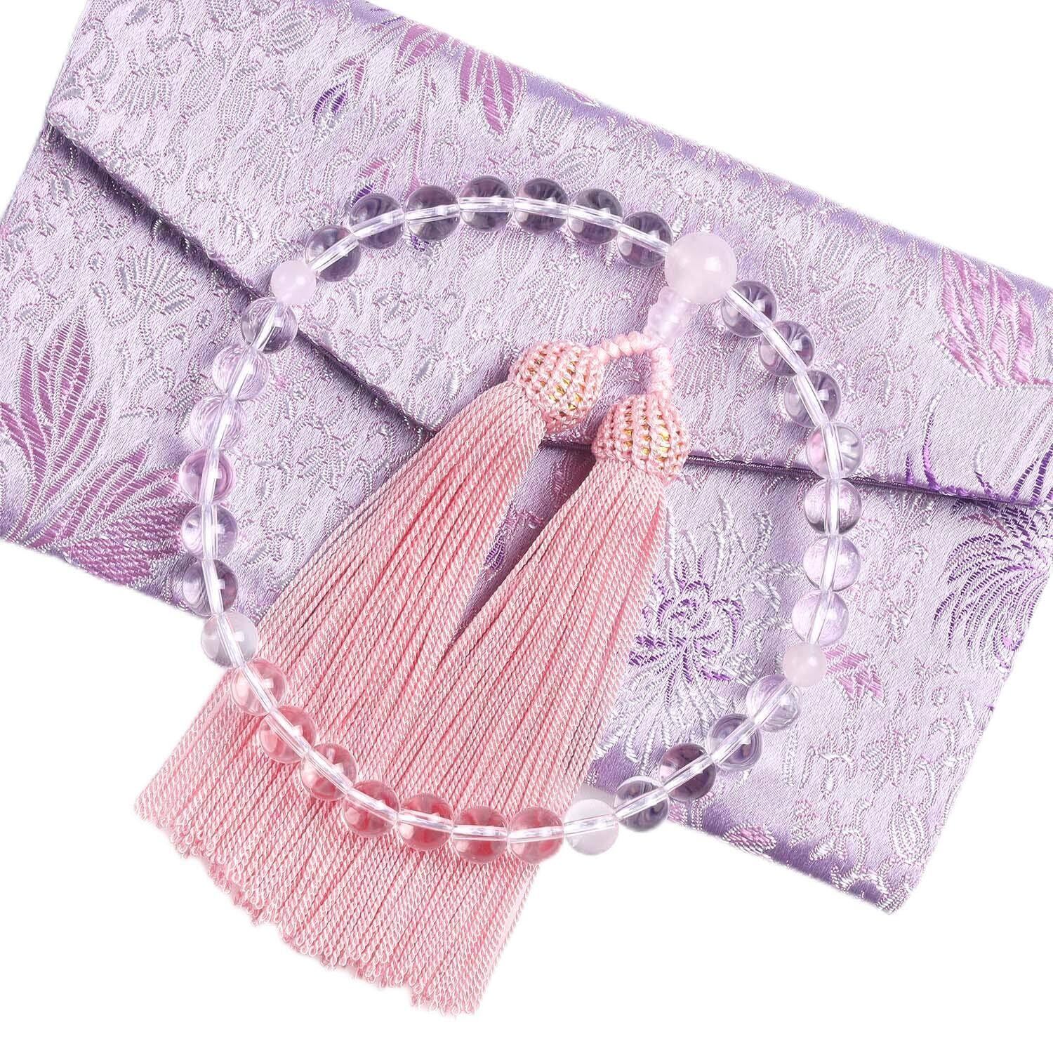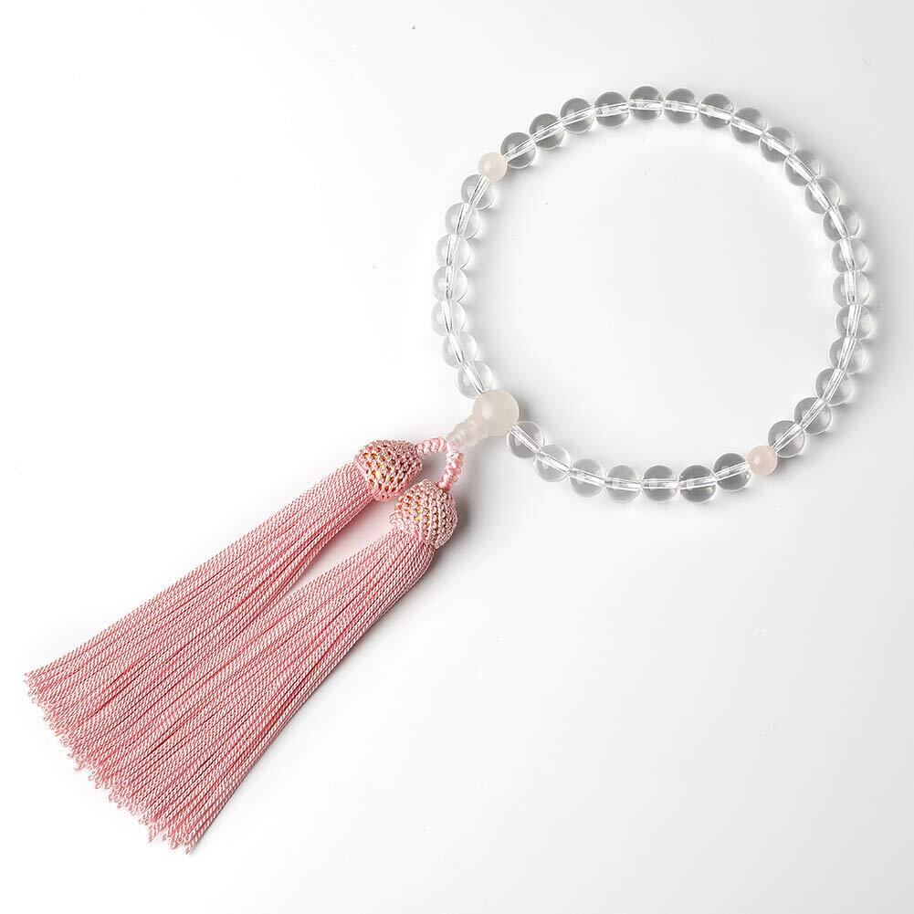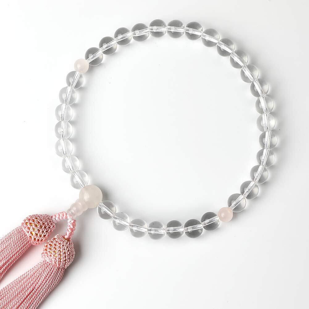 LEOBEE 数珠 念珠 女性用 本水晶 紅水晶(ローズクォーツ) マグネット式数珠袋付き 全ての宗派でお使い頂けます