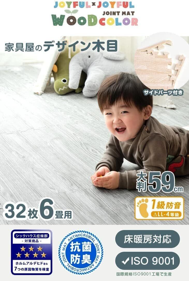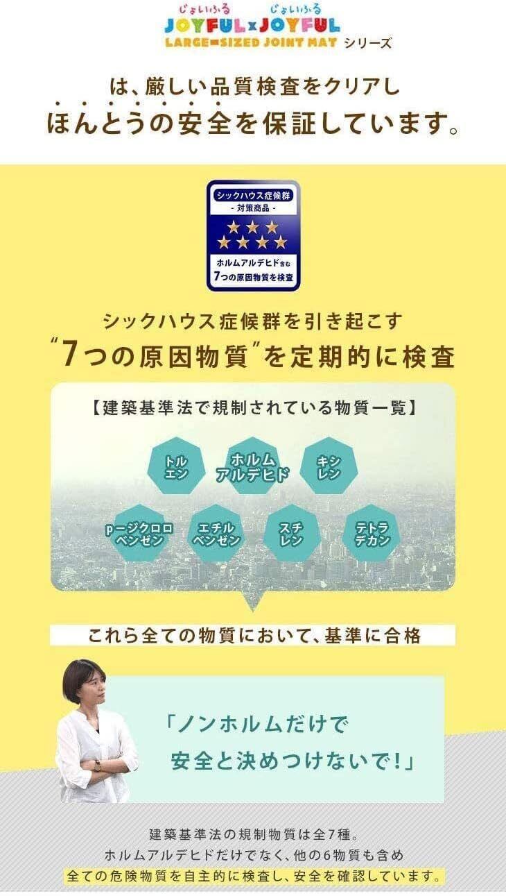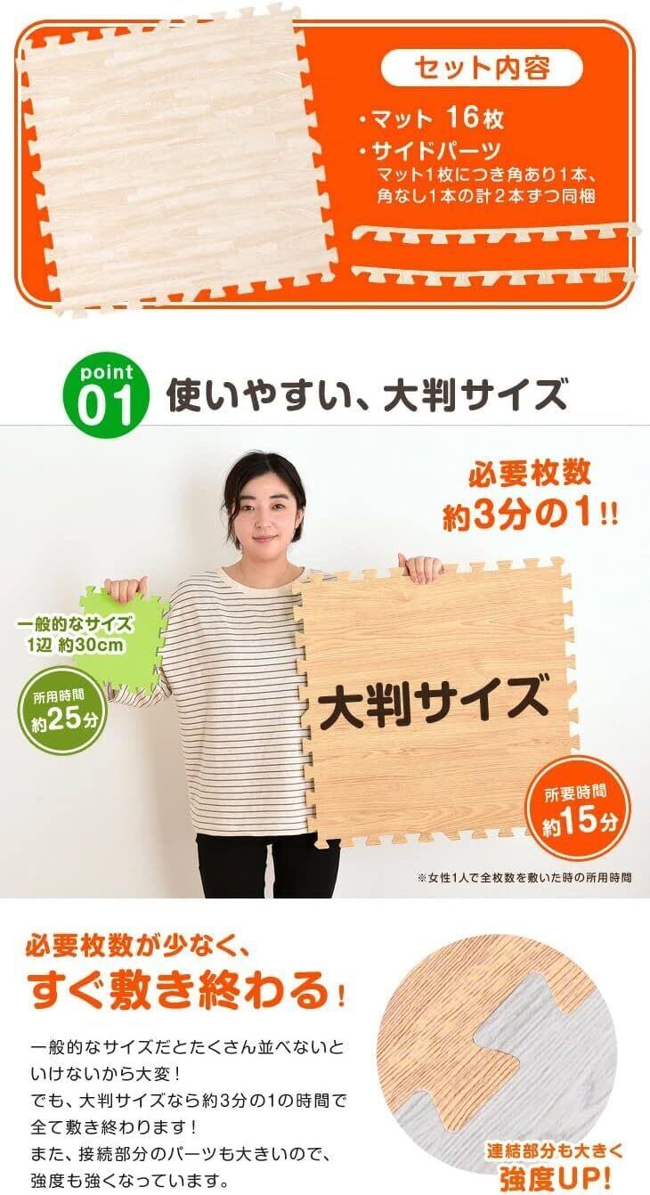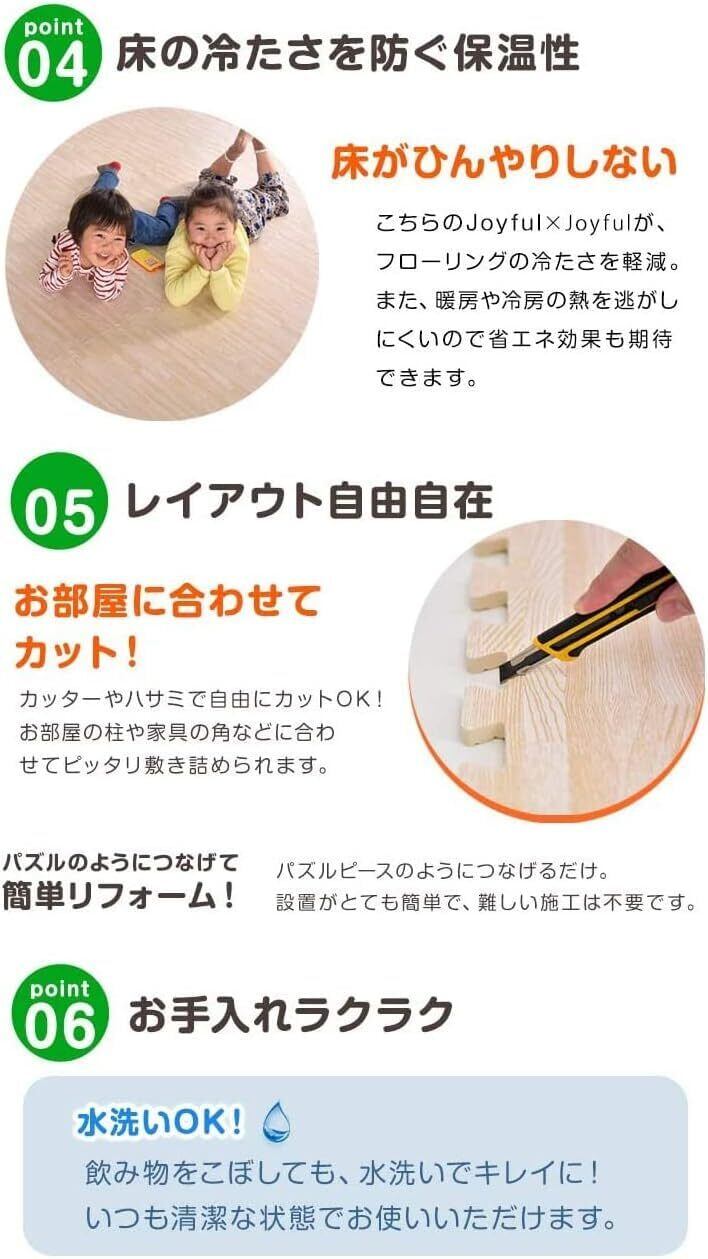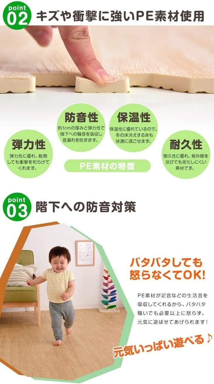 【備考】・マット毎に若干の色の違い、見る角度による色の違い等がありますが、これはPEマットの加工特性であり、 使用上の品質には問題ございません。 ・生産上マットをカットする際に生じた粉末が付着している場合がございます。一度綺麗に水拭きしてからご使用ください。 色落ちではありませんので、ご安心ください。 ・重量物を載せますと、マットが凹み変形する恐れがあります。 ・床暖房の種類等によって、商品に多少の反りが生じる場合がございます。予めご了承ください。 ・ロットによって色味が異なる場合がございます。 ・商品の仕様上、ジョイント部分(サイドパーツ含む)の木目の柄は合わない場合がございます。 ・PE素材の特性上、使用するうちに負荷がかかる部分に多少のへたりが生じる場合がございます。 そのため、既に使用しているマットに新しいマットを繋げて使用する際、上手く繋がらない場合もございますので、予めご了承ください。