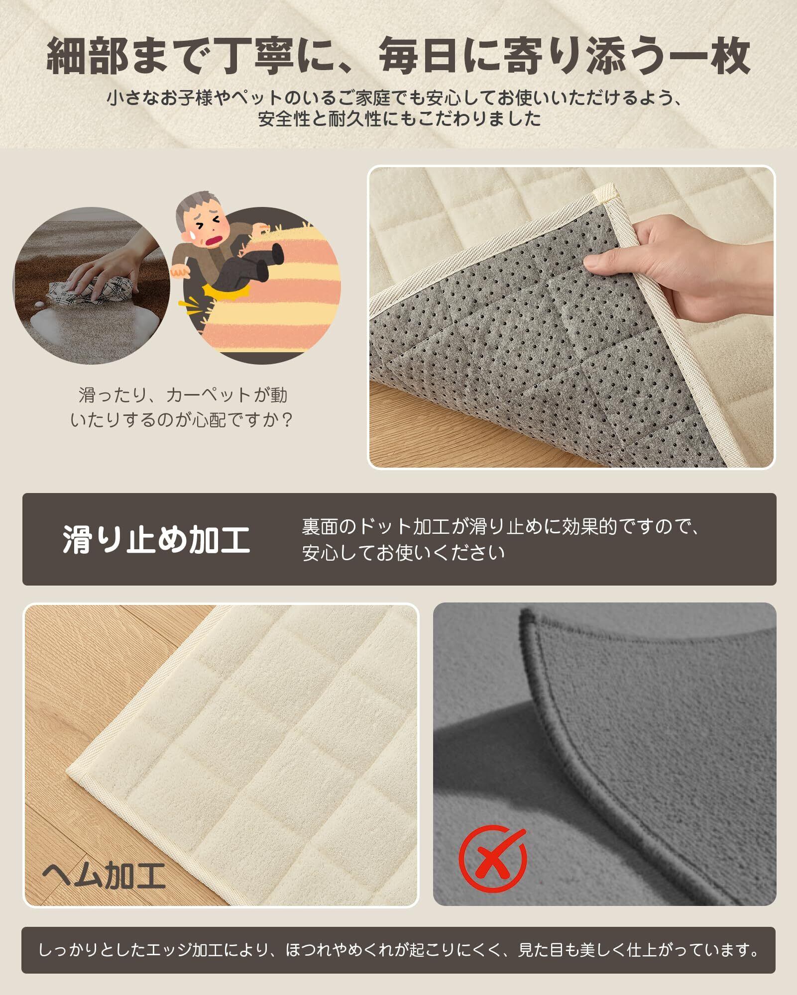 【滑り止め加工・抗菌防臭】耐久性にもこだわり、日常使いしやすい仕様に仕上げました。裏面には滑り止めのドット加工を施しており、ラグがずれにくく、快適にお使いいただけます。また、ヘム加工によるしっかりとしたエッジ仕上げで、ほつれやめくれが起こりにくく、美しい状態を保ちます。さらに、抗菌・防臭加工を施しているため、清潔に使いやすく、毎日の暮らしに寄り添うラグです。