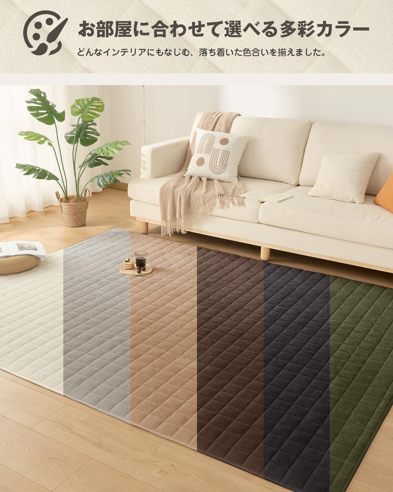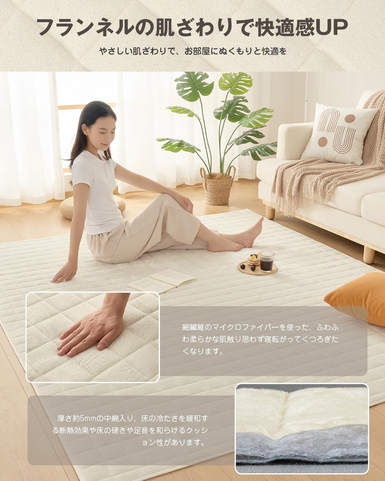 【フランネルキルトラグ・オールシーズン快適】極細繊維のマイクロファイバーを使った、ふわふわ柔らかな肌触り思わず寝転がってくつろぎたくなります。毛足の向きによって色の見え方が変わるのもフランネルラグの特徴です。光や見る角度で色の雰囲気が変わり、様々な表情を見せてくれます。毛足が短いため、夏はさらっと快適に、寒い季節でもホットカーペット対応で一年中お使いいただけます。オールシーズン快適に使えるラグです。