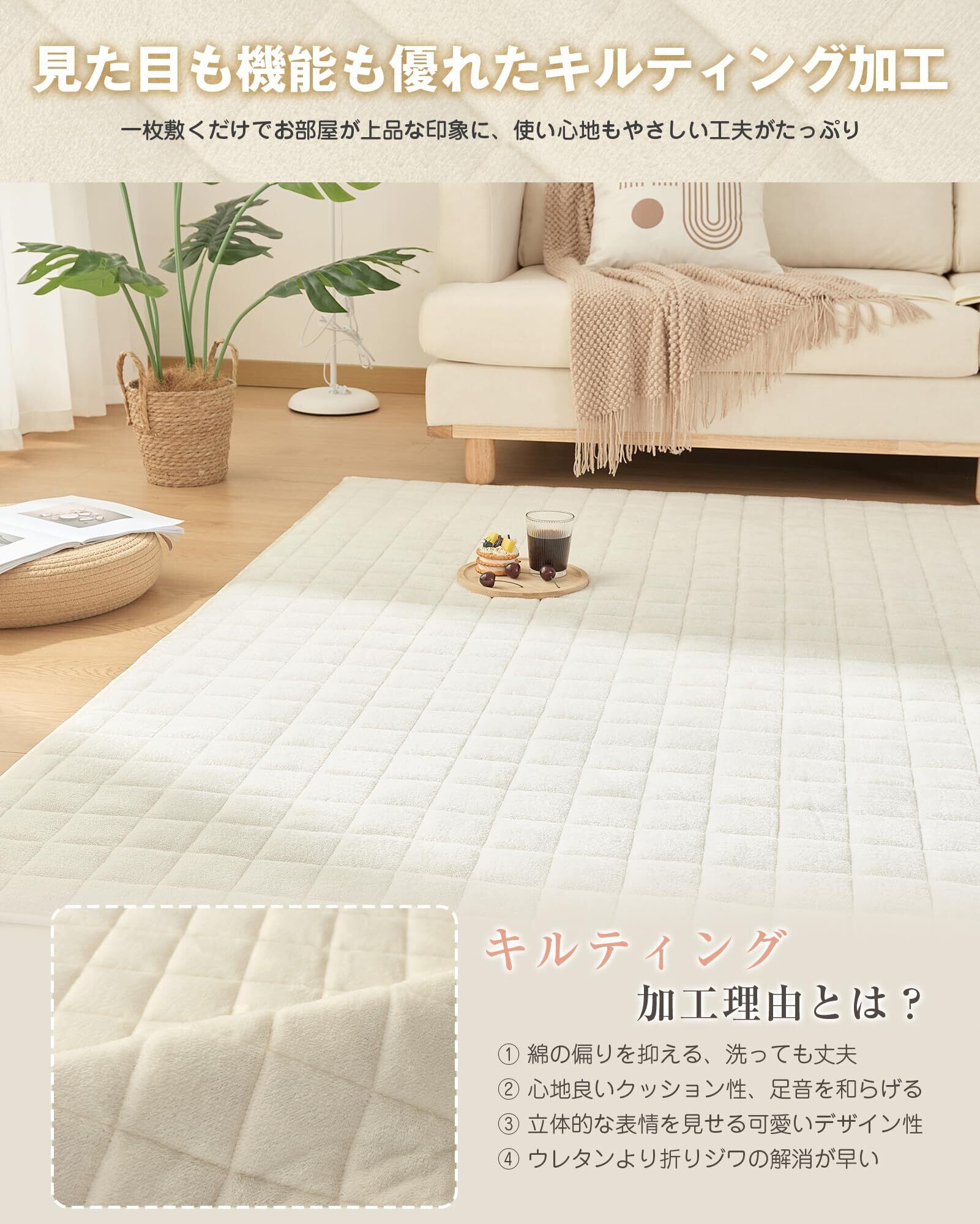 VK Living ラグ カーペット キルトラグ 190×240cm(約3畳) フランネル 【立体キルティング×マルチシーン対応】 ラグマット 絨毯 洗える 滑り止め付き オールシーズン ふわふわ肌触り 抗菌防臭 床暖房 ホットカーペット対応 アイボリー