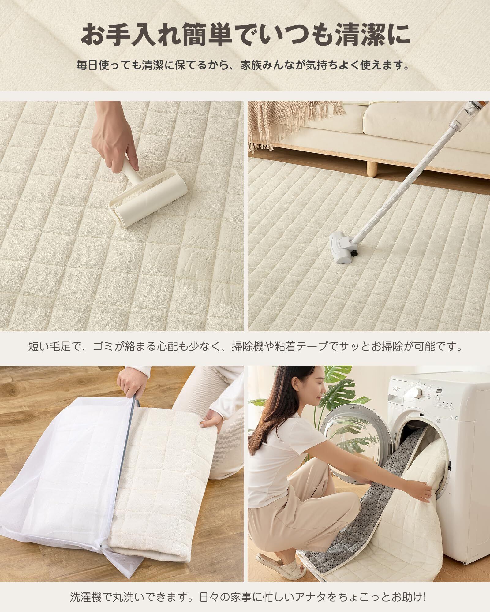 【軽量設計・お手入れ簡単】毛足が短いのでゴミが絡まる心配も少なく、掃除機や粘着テープでサッとお掃除が可能です。ご家庭の洗濯機でまるっと洗えてお手入れ簡単です。フランネルキルトラグは軽く取り扱いが簡単、移動や収納も楽々です。また、折りたたみやすく、使わない時の収納も省スペースで行えます。
