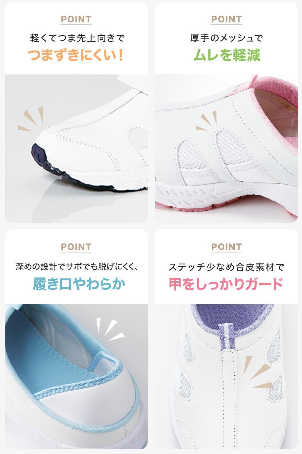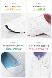 ヒールカップ式デザインで安定感抜群、看護・介護・医療現場に最適です。