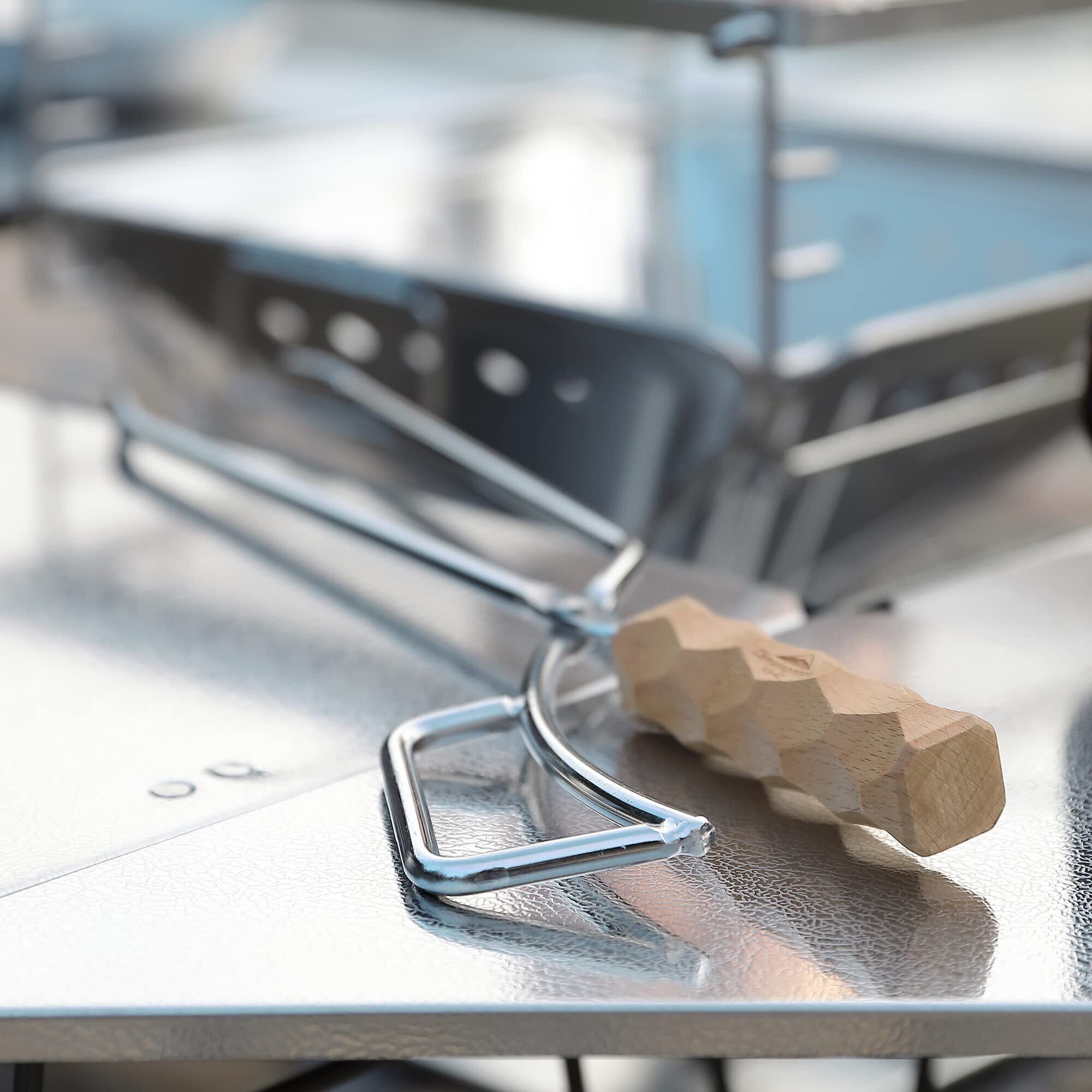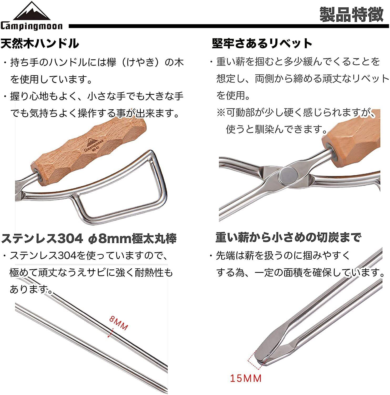 特徴:①ステンレス極太無垢丸棒と天然木を使った火鋏。 ②先端は少し広く平たくなっているため、重い薪から小さめの切炭まで掴めます。