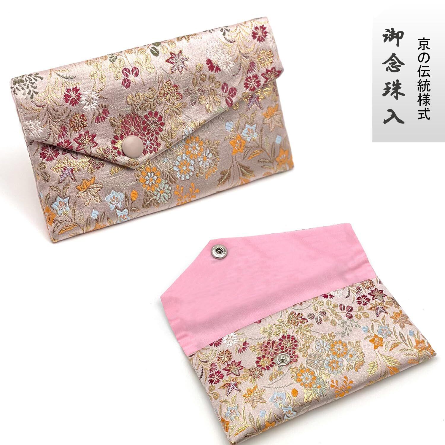 数珠袋の特徴:ソフトな色づかいの上品な柄が素敵な金襴(きんらん)。淡い色の梅菊や草の背景に、落葉文様を織り上げた西陣織の数珠袋です。