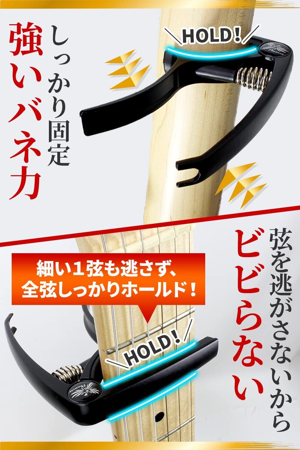 【強力ホールド】強力なバネで弦をしっかりと押さえ付けます。カポタスト選びでありがちな失敗は、全ての弦が正しくホールドされず、本来の音が出ないことです。これは演奏を台無しにしてしまう、致命的な欠陥ですよね。しかし当製品は、内蔵の強力なバネが細い1弦まで確実に押さえ、洗練された音色を響かせることをお約束します。