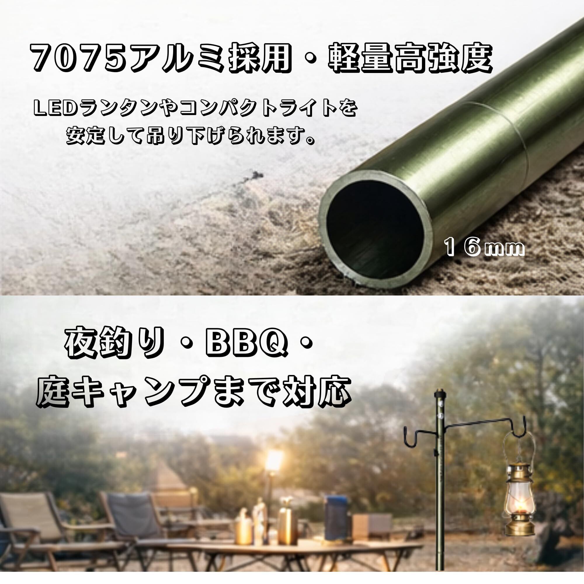 【7075アルミ採用・軽量高強度】 航空機にも使用される7075アルミ合金を使用し、軽量ながら高い強度を実現。最大耐荷重1kgで、LEDランタンやコンパクトライトを安定して吊り下げられます。