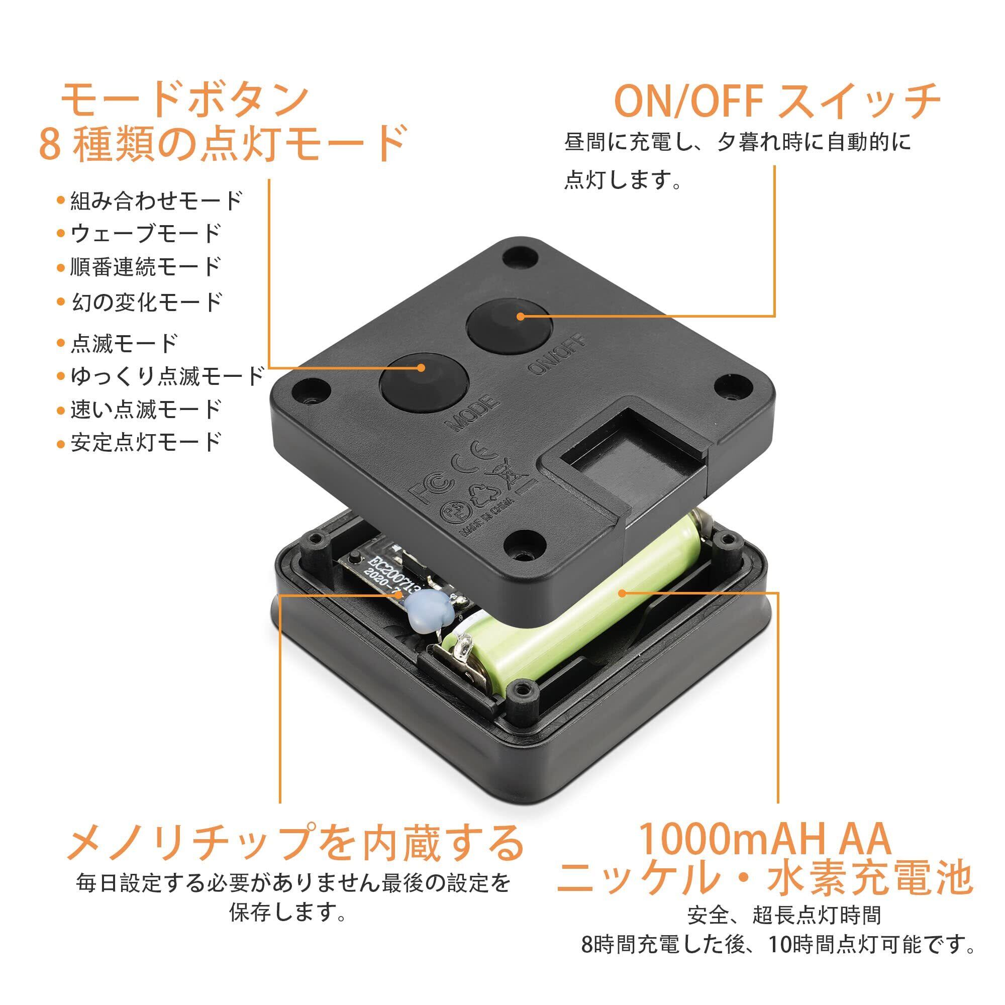 【ソーラー充電で電気代0円!超長点灯時間】太陽光で充電できるので、電気代がかかりません。800mAHの超大きい充電池を使用して、8時間充電した後、10時間点灯可能です。雨の日などは充電時間が延長されるかもしれません。