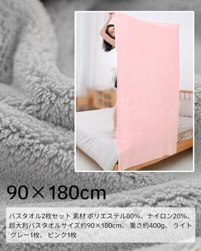 【バスタオル2枚セット】素材:ポリエステル繊維 80% + ポリアミド繊維 20%、サイズ:約90×180cm、セット内容: イトグレー 1枚+ピンク1枚