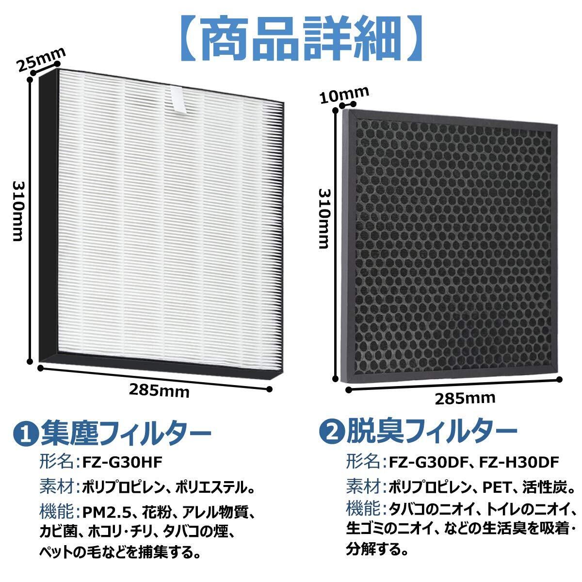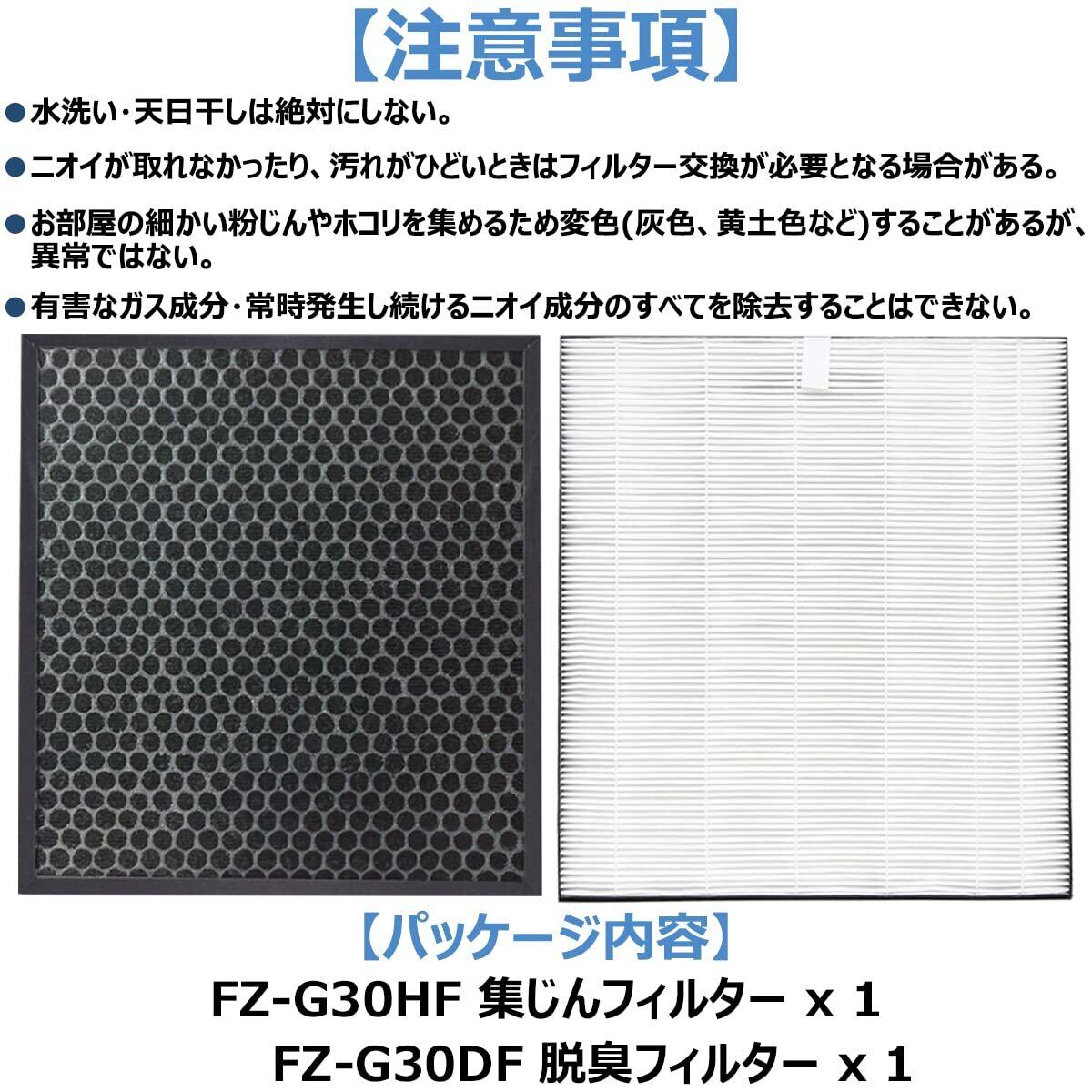 【形名】集じんフィルター FZ-G30HF 、脱臭フィルター FZ-G30DF/FZ-H30DF 。素材:ポリプロピレン・ポリエステル・PET・活性炭。