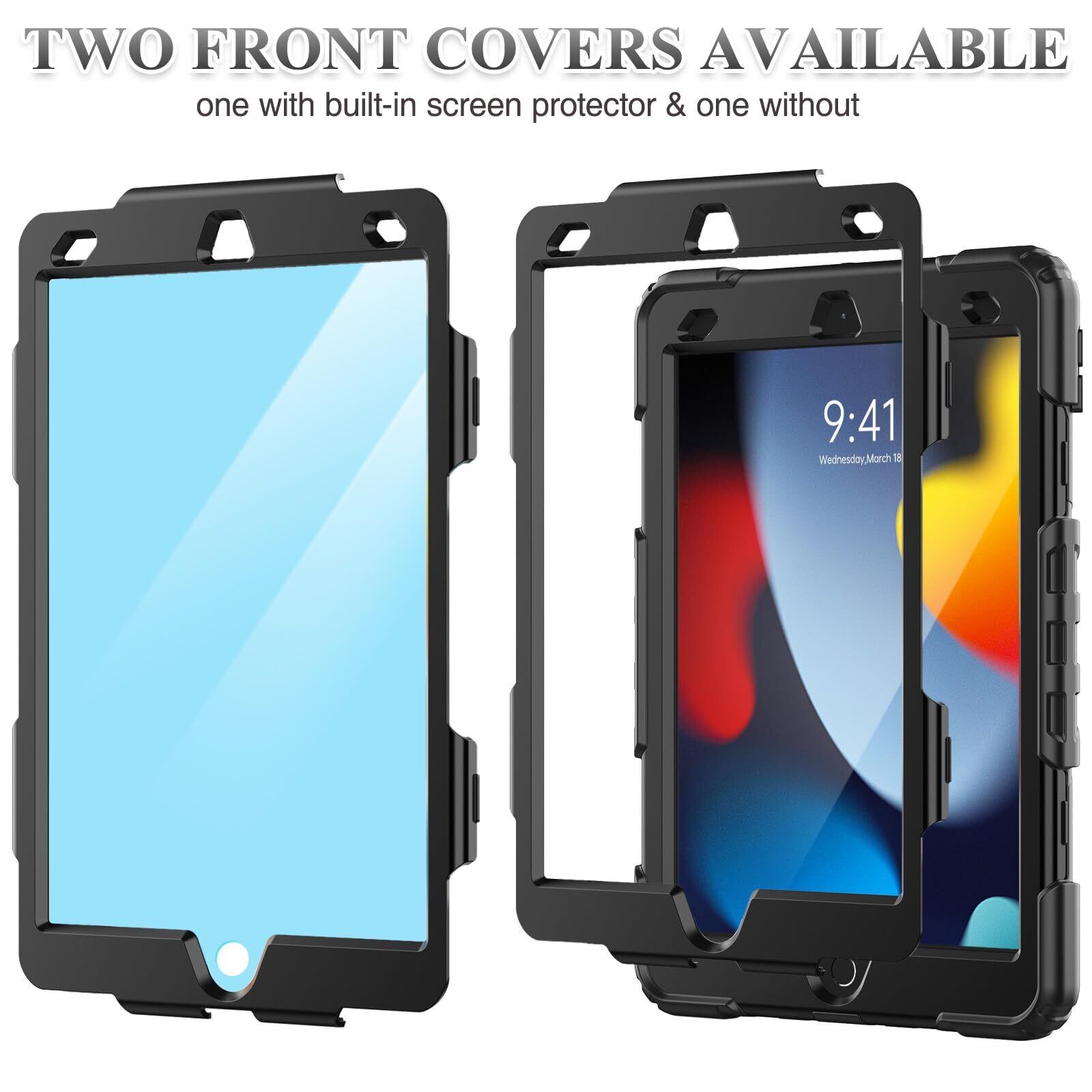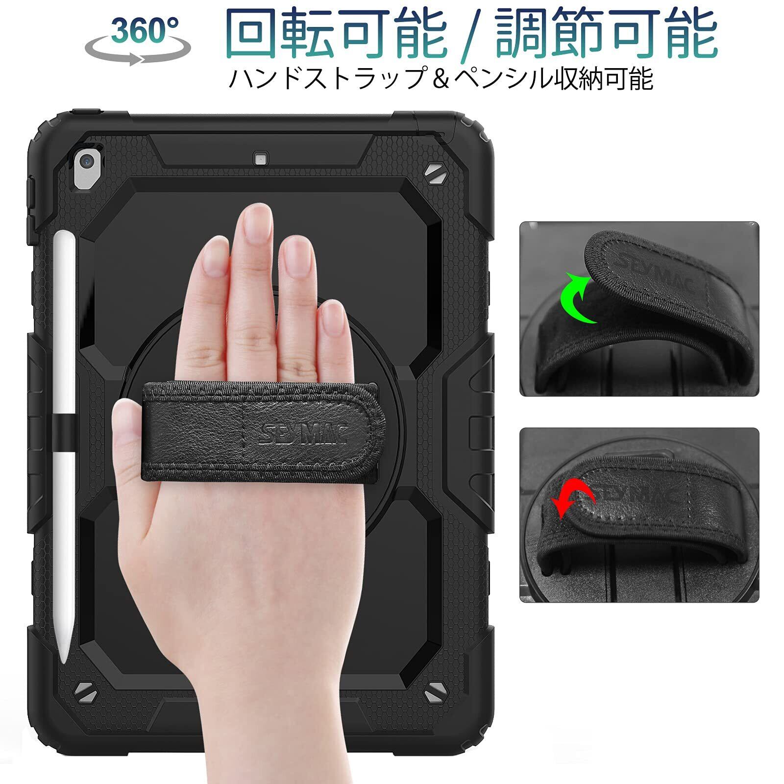 SEYMAC stock iPad 10.2インチ 第9/8/7世代 ケース 耐衝撃 保護フィルム付き ペン収納 360°回転スタンド ハンドストラップ ショルダーストラップ 全面保護カバー (ブラック)