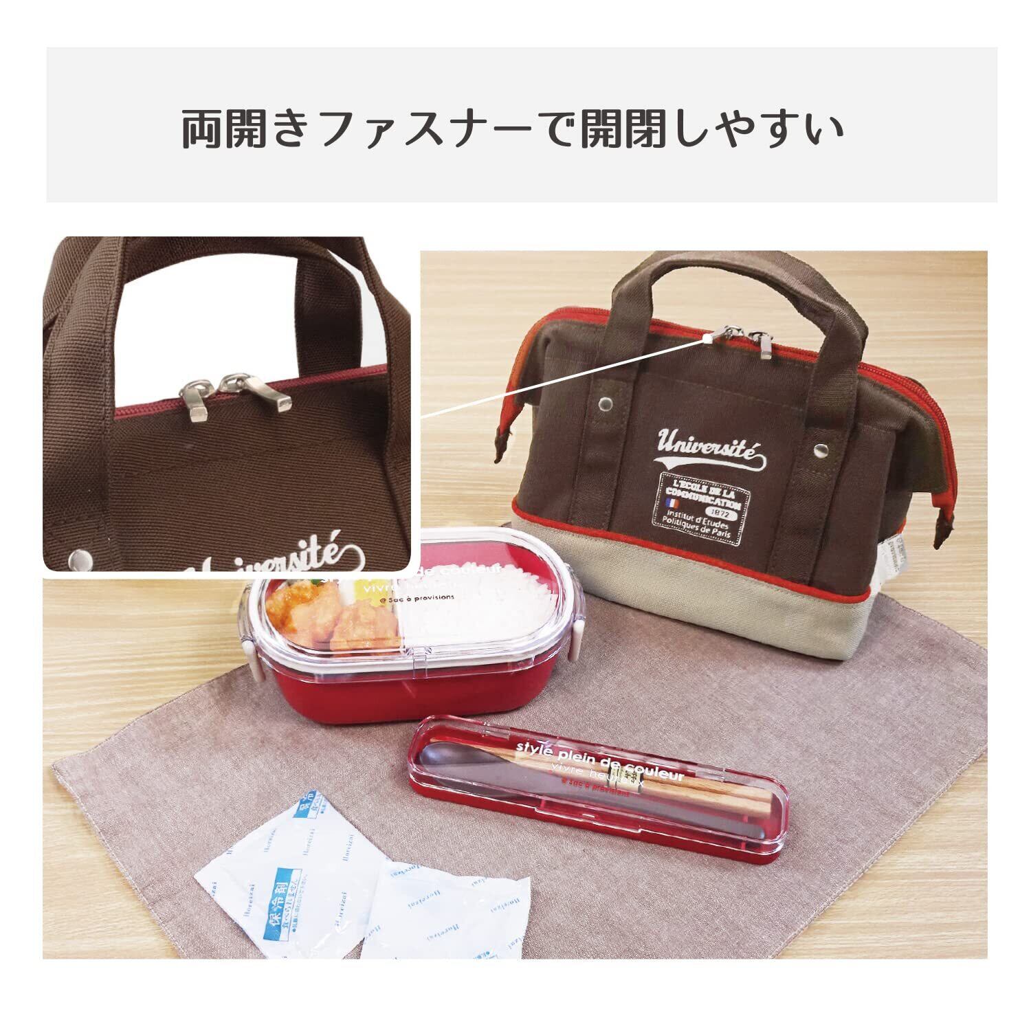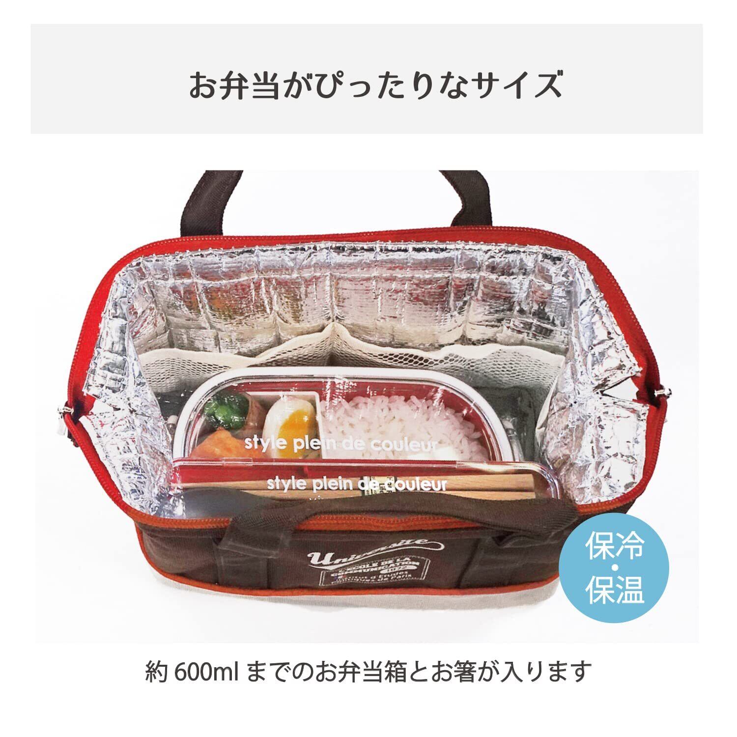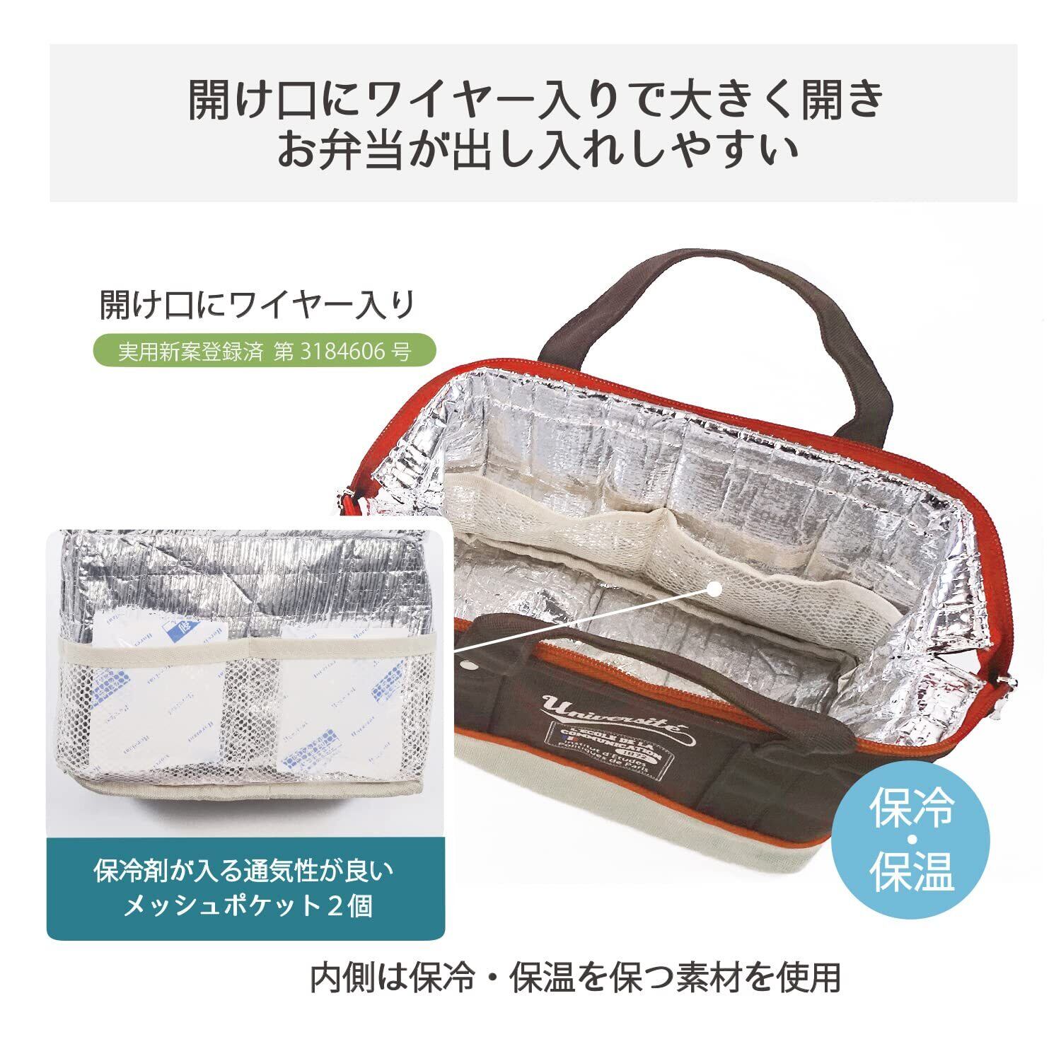 【しっかり保冷で機能的】内側はアルミ素材使用で保冷保温。開閉は両開きファスナーで開閉しやすく端まで閉まるので中の冷気を密封します。内側には通気性の良いメッシュポケットが2個付いていて保冷剤などが入ります。またおしぼりやソース、粉末スープなど細かいものを仕分けて収納できます。