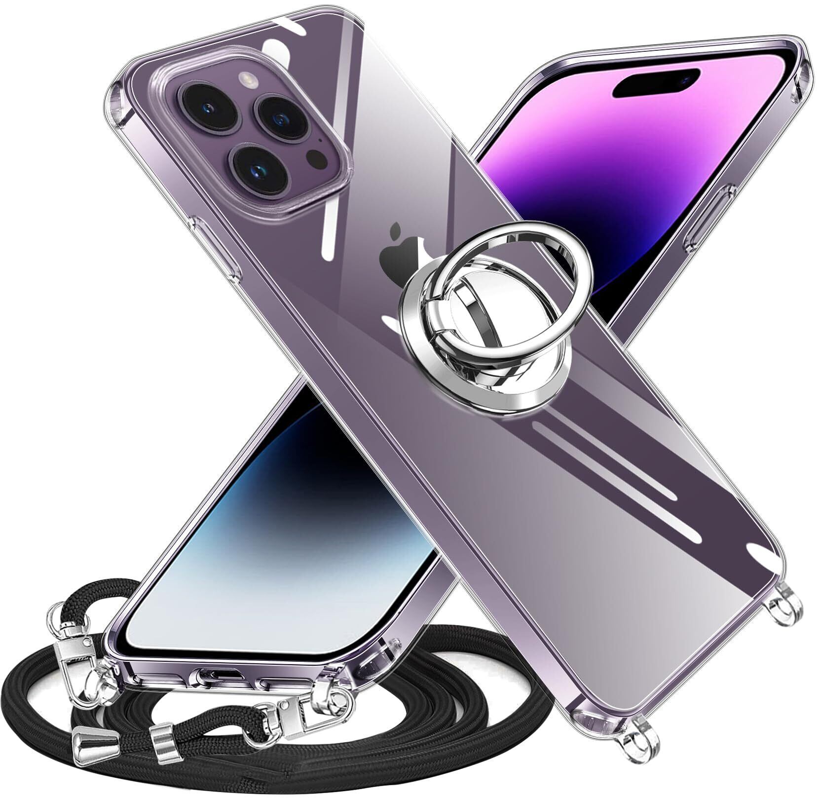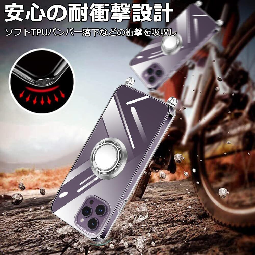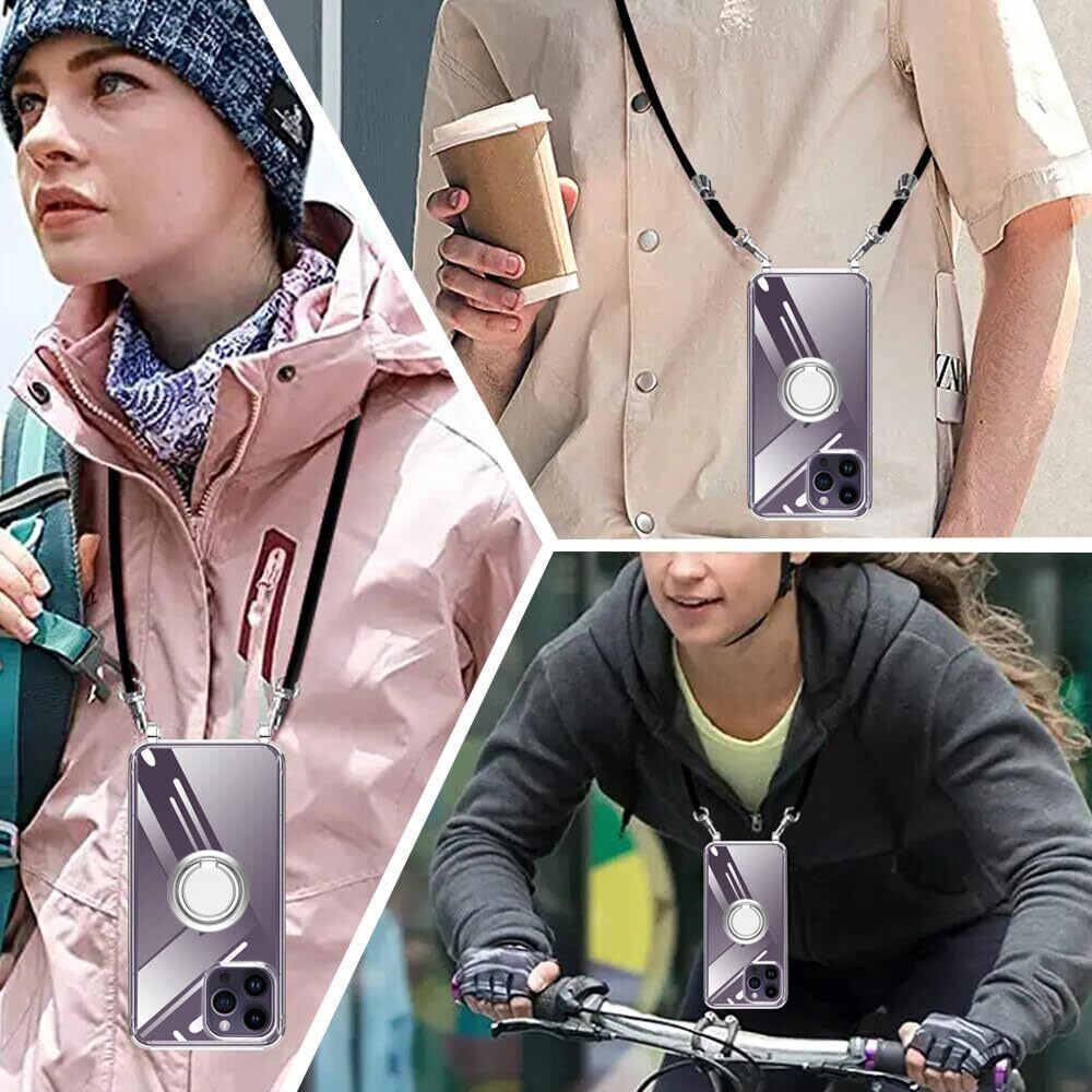 iPhone 14 Pro 用 スマホケース 多機能スタンド アイフォン14Pro カバー 肩掛け 斜めかけ 縄掛けケース 透明 PC+TPU 薄型 軽量 耐衝撃 長さ調整可能 取り外し可能 ネックストラップ ショルダー ケース 落下防止 紛失防止 (クリア)