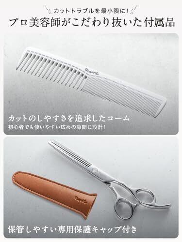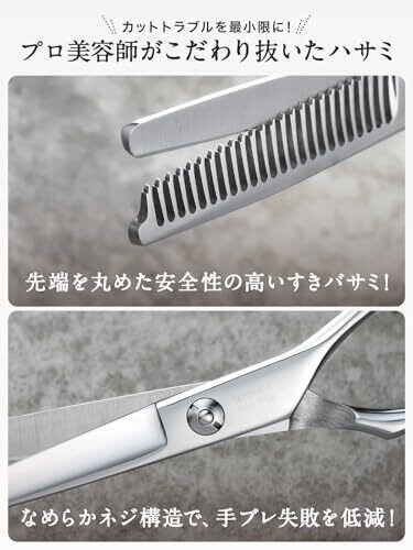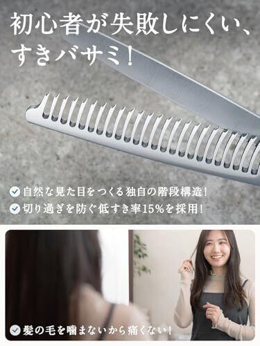 【商品仕様】 一般的なすきバサミはすき率25%以上ですが、こちらはすき率15%。すき率を抑える事によって、切りすぎることなく初心者の方でも失敗するリスクを抑え、自然に仕上げることができます。