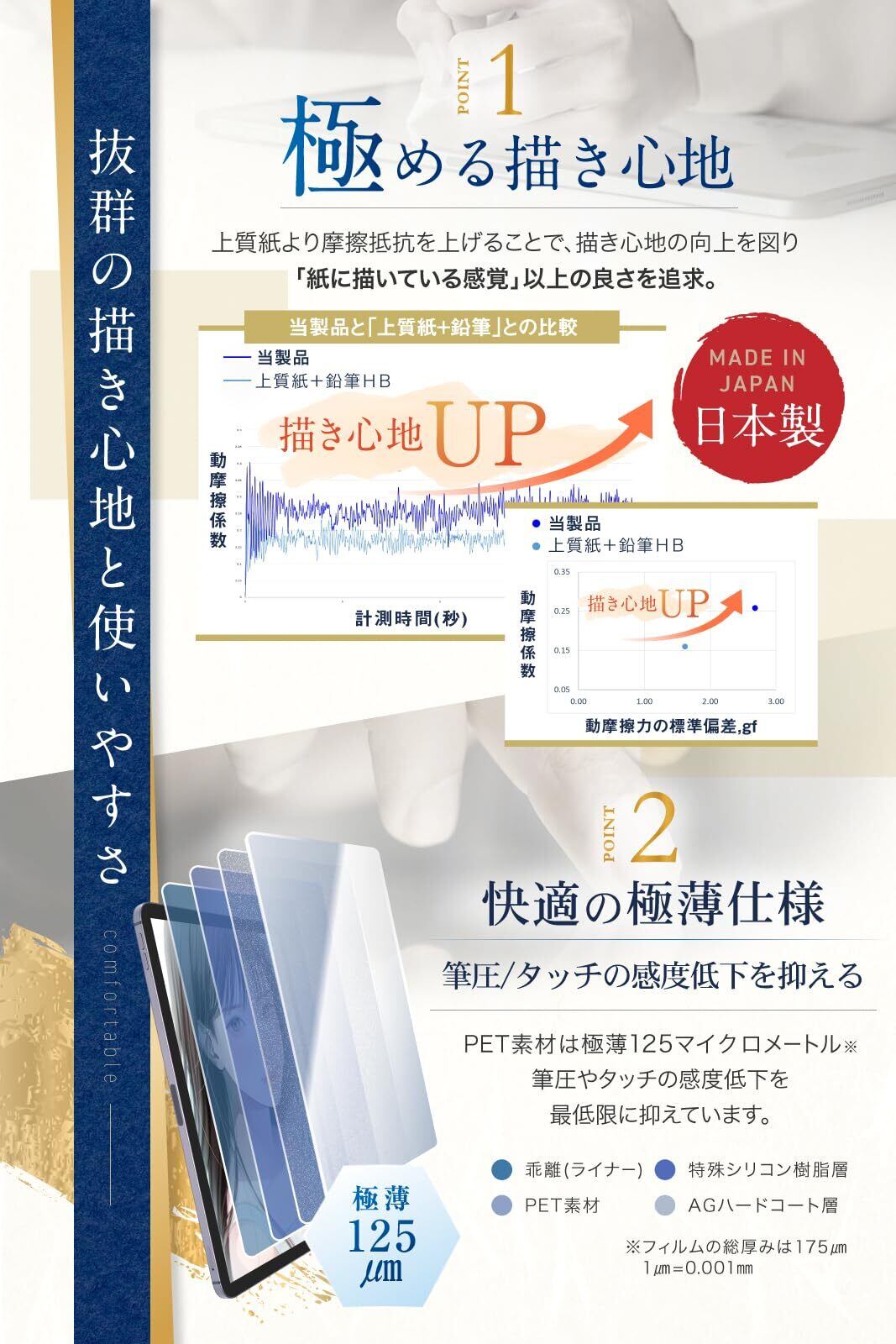 【快適の 極薄仕様 】 フィルム のPET部は厚み 0.125 マイクロメートルの極薄仕様。 筆圧 や タッチ の 感度低下 を 最低限 に抑えています。