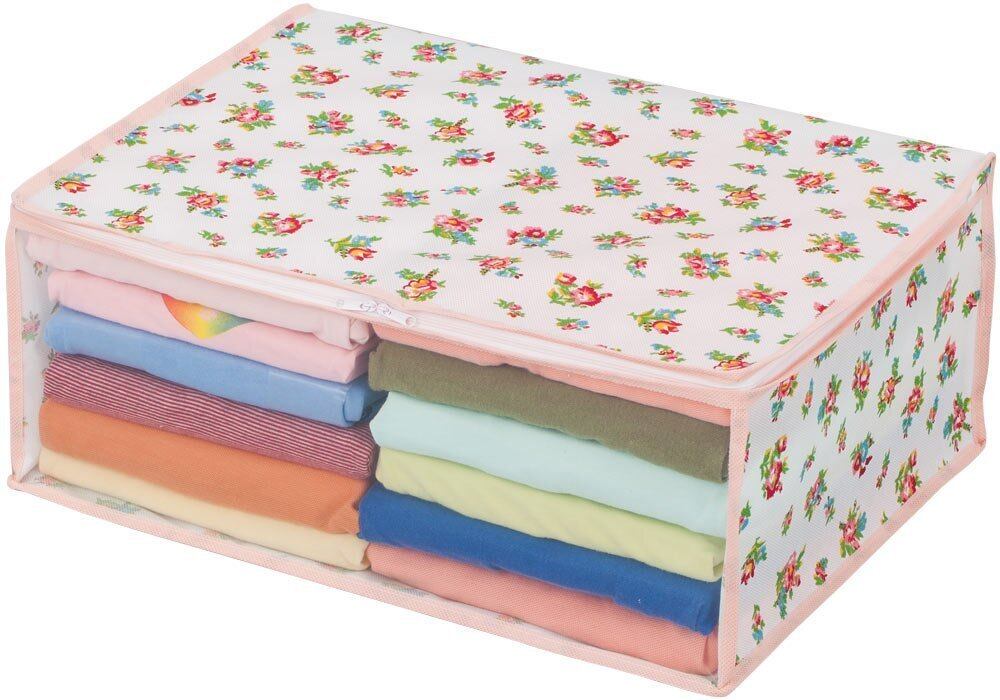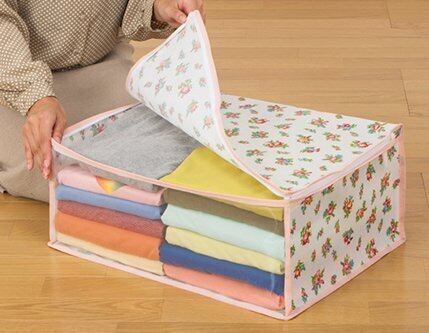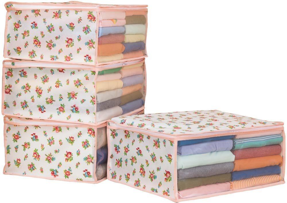 【商品仕様】:サイズ/約幅48×奥行35×高さ20cm、カラー/ホワイト、柄/プチローズ柄、内容/4個組、収納目安(1個あたり)/厚手セーターなら約5~7枚・薄手シャツなら約20~25枚、材質/ポリプロピレン・ポリエチレン
