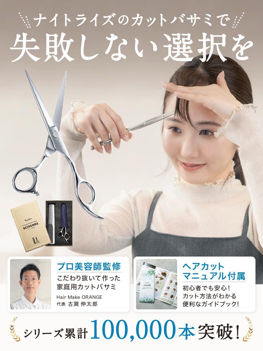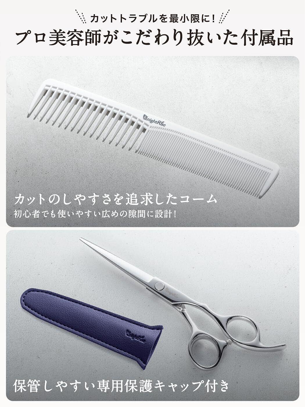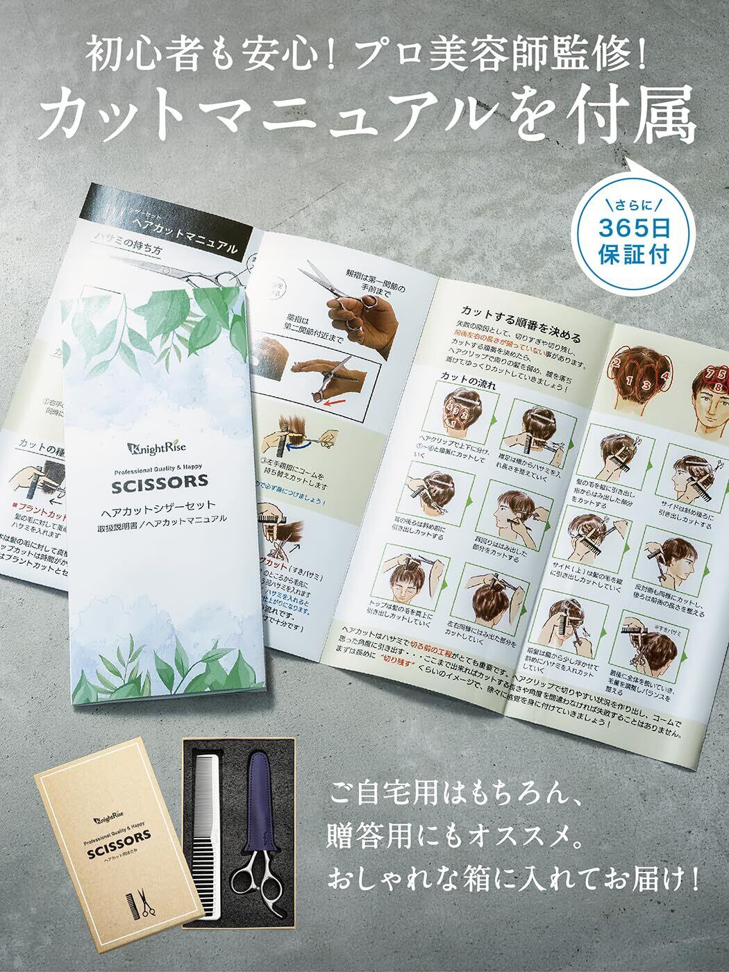【商品内容・保証】 カットバサミ本体に、ハサミケース、コーム、調節器具、掃除布、使用方法やお手入れ方法を詳しく記載したリーフレットをお付けしてオリジナルパッケージにお入れしてお届け致します。 ナイトライズすべての製品には1年間の長期保証がついております。検品には十分に時間をかけて行っておりますが万が一不具合がありましたらご遠慮なくお問い合わせください。24時間以内に責任を持って対応させていただきます。