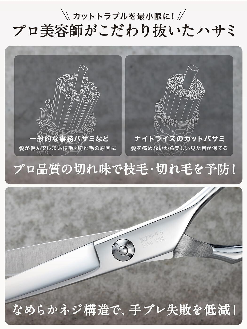 【プロ美容師が徹底監修】 握りやすさや刃の形状、重心バランスまで細部にこだわり、細かい微調整を重ねて生まれた仕上がりに妥協しないカットバサミです。