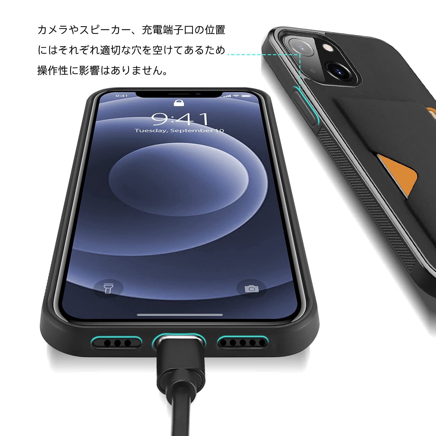 【対応機種】iPhone 13 mini。カメラやスピーカー、充電端子口の位置にはそれぞれ適切な穴を空けてあるため操作性に影響はありません。また、各ボタンはケースとひと繋ぎでカバーすることで埃の混入を防ぎます。