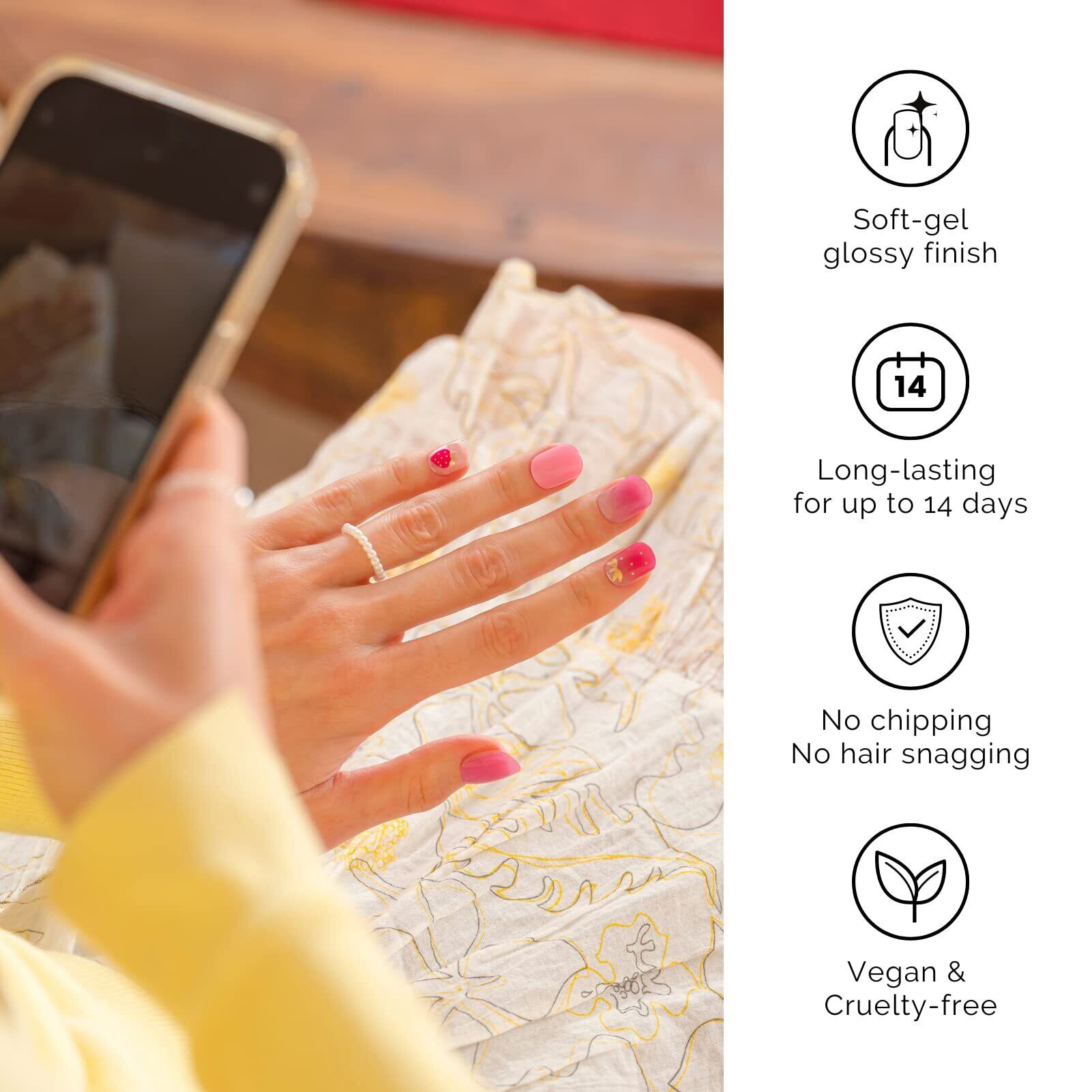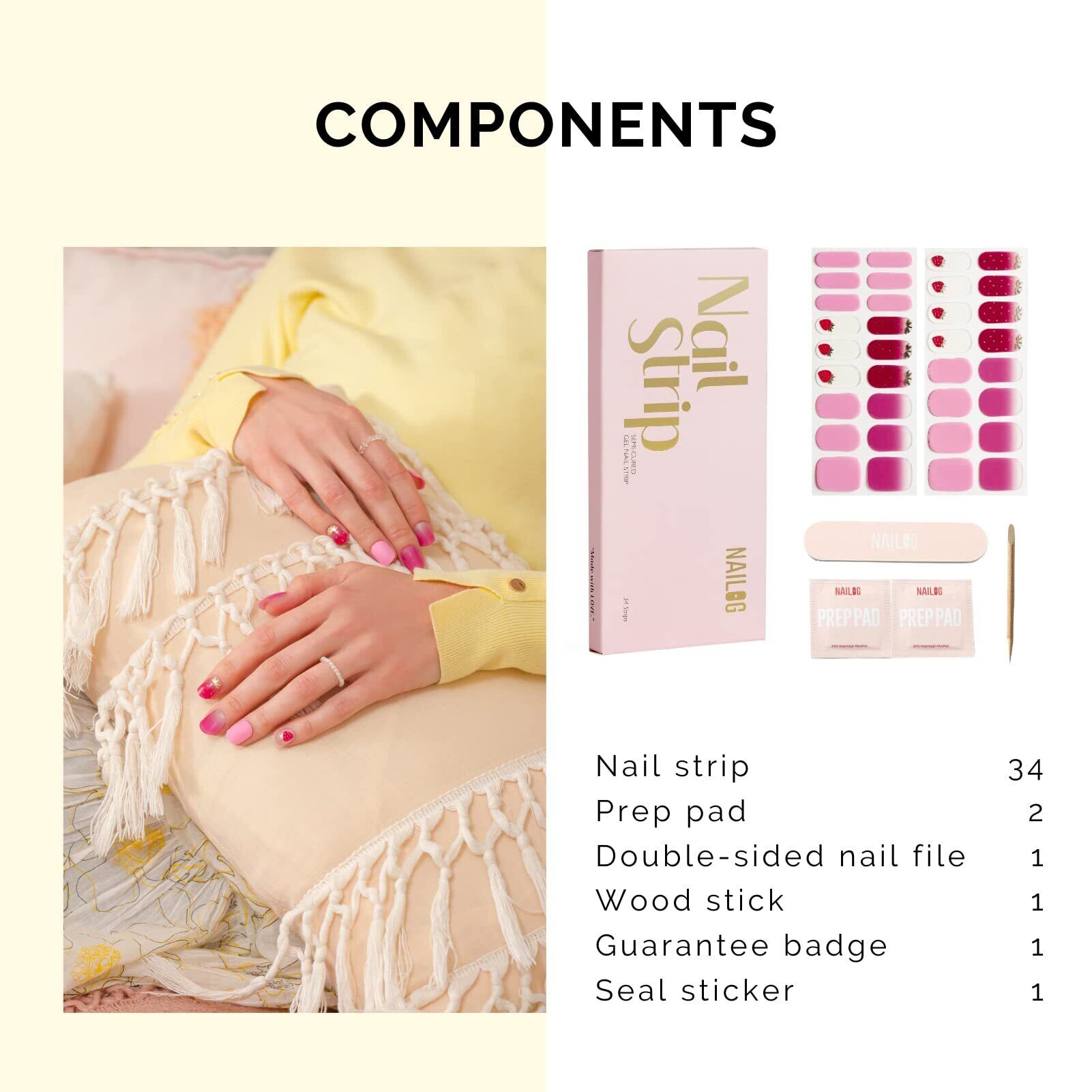 NAILOG 半硬化ジェルネイルシール (34枚),長持ち、サロンクオリティー、ネイルステッカー 、ネイルキット、綺麗な光沢感、可愛い、アートデザイン、ピンク、春夏、いちご│Strawberry Love