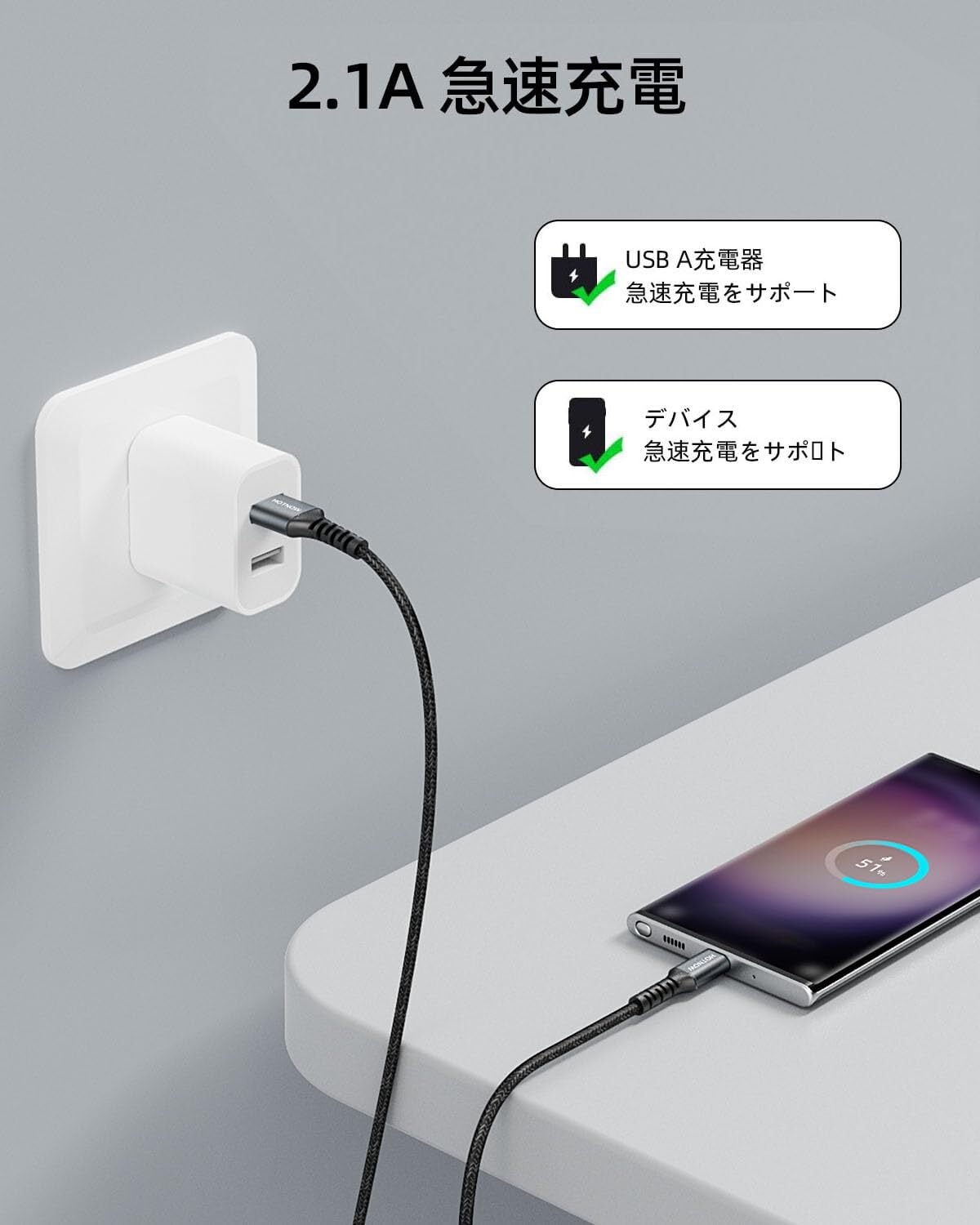 【急速充電】24AWG銅線コアとUSB2.0(480 Mbps)で2.4Aの電流急速充電をサポートPCでのデータ転送