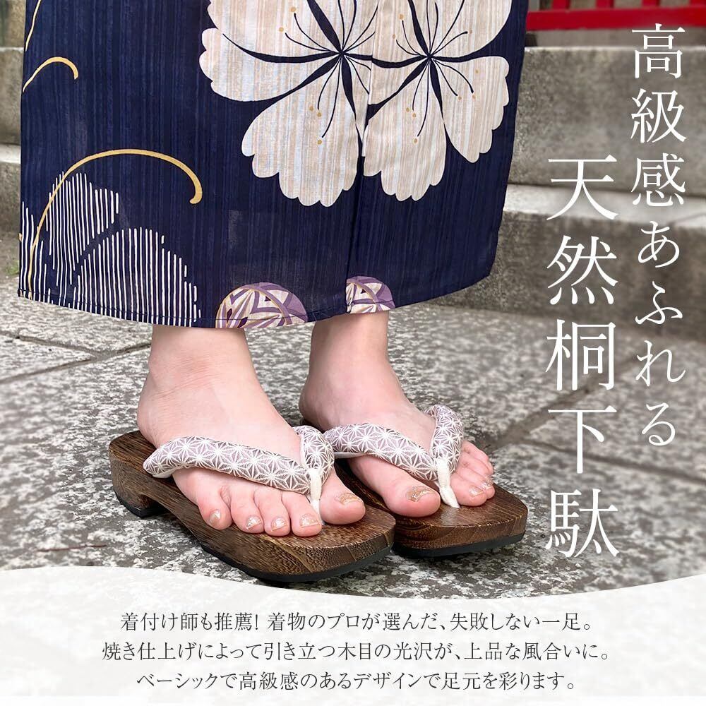 大人気!自然な木目を生かした女性用桐下駄。ふんわり鼻緒で長時間使っても痛くなりにくいと評判。下駄底もゴム素材で衝撃を吸収。足やひざ、腰への衝撃を和らげ、また歩く音も静かです。 長く、またどんな世代でも愛用頂けるよう、シンプルで可愛い色合いに厳選。柄は無地柄と麻の葉の2柄、桐台の色は茶焼き、黒焼きを揃えました。