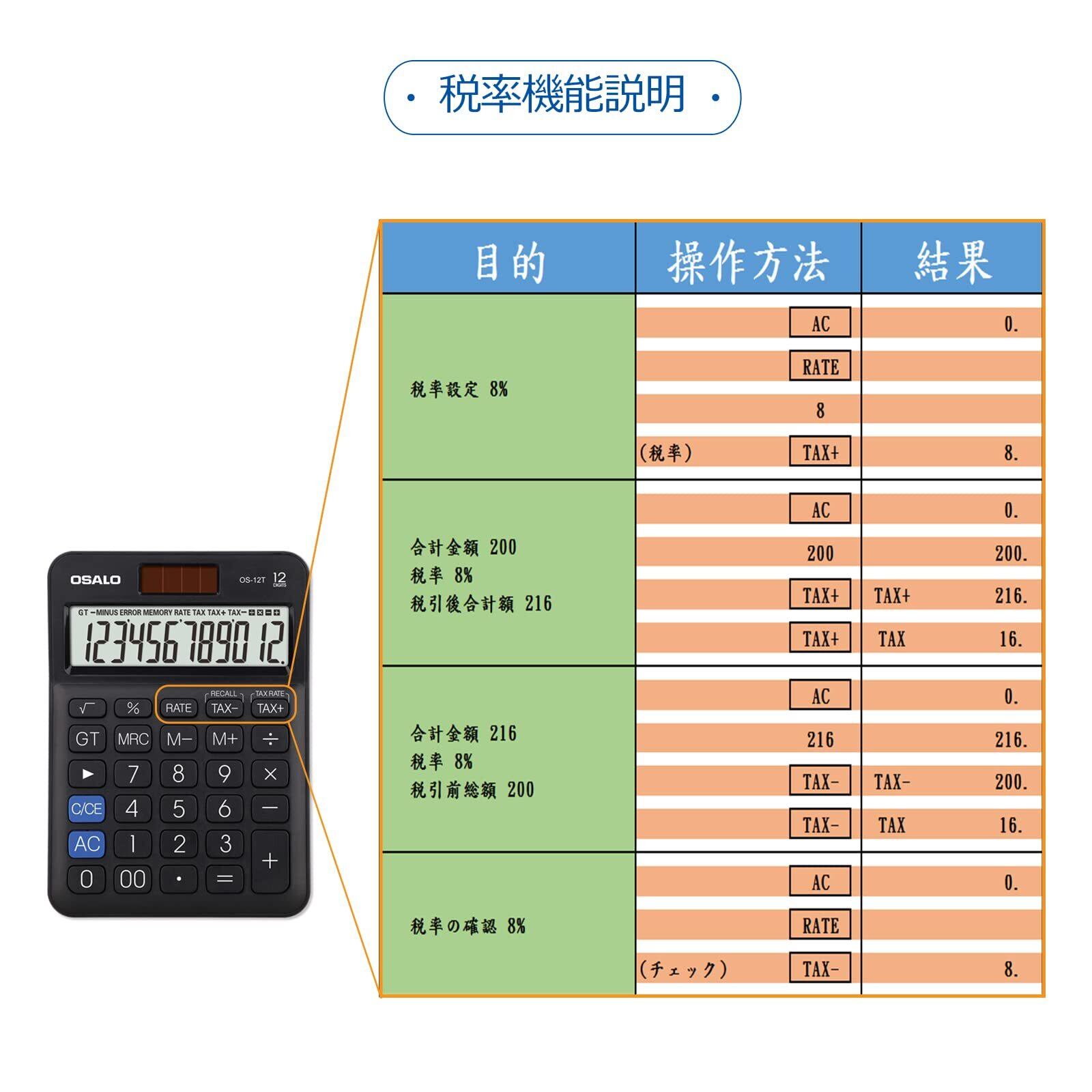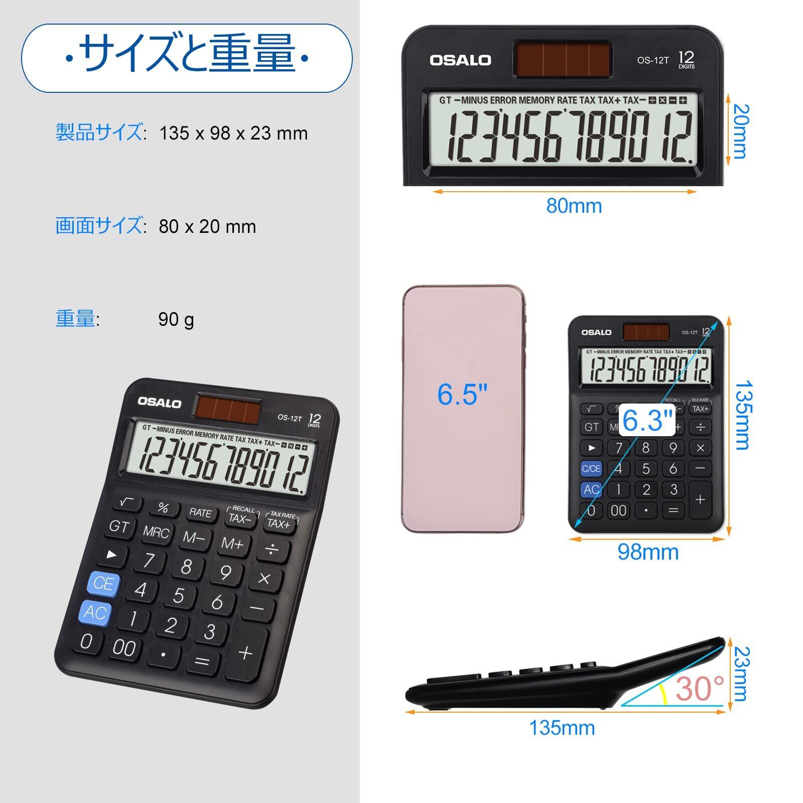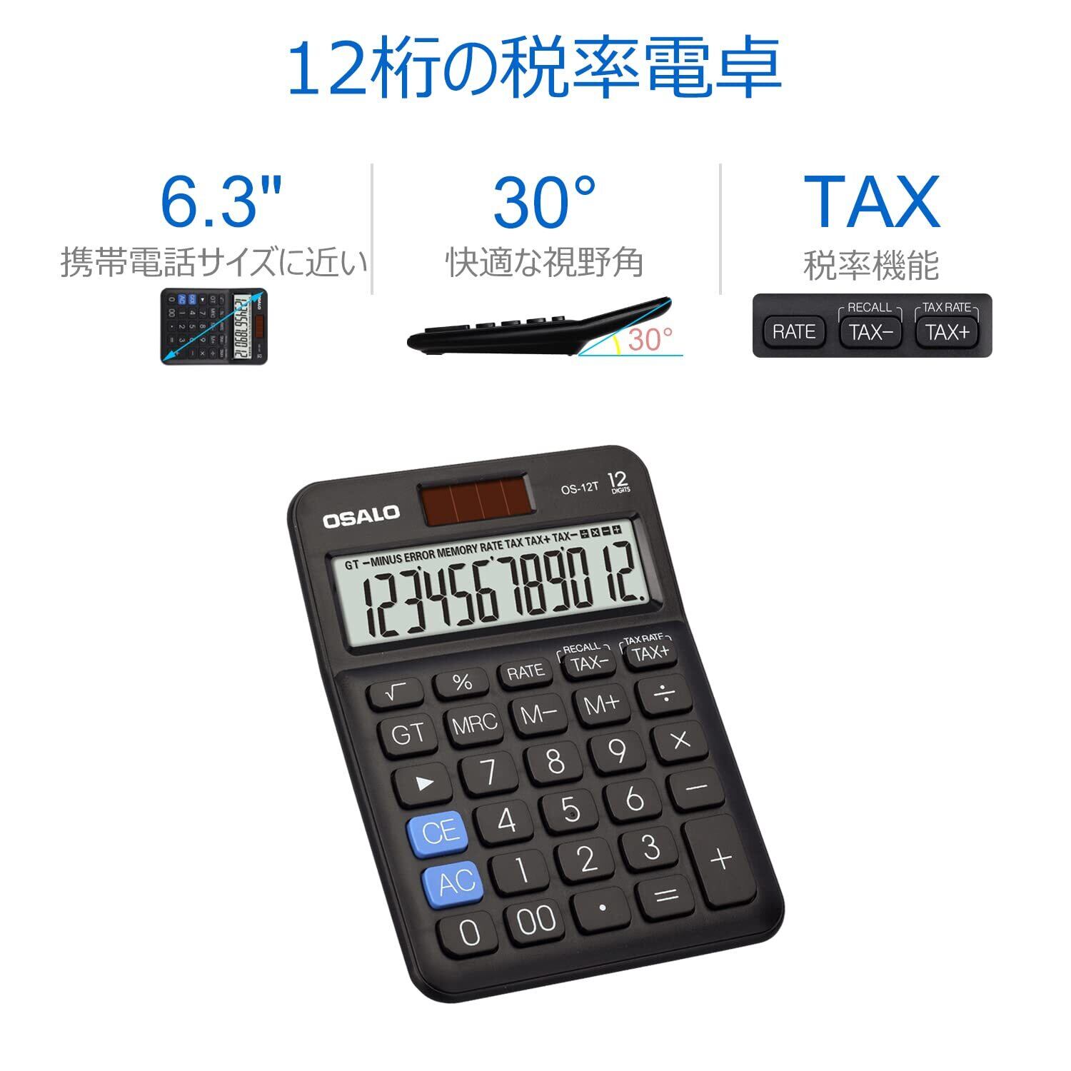 卓上電卓 大型LCDディスプレイ 12桁 数字ビッグボタン 税金会計計算機 電池式 太陽光発電 デスク オフィス 自宅 ビジネス用 (OS-12T 黒)