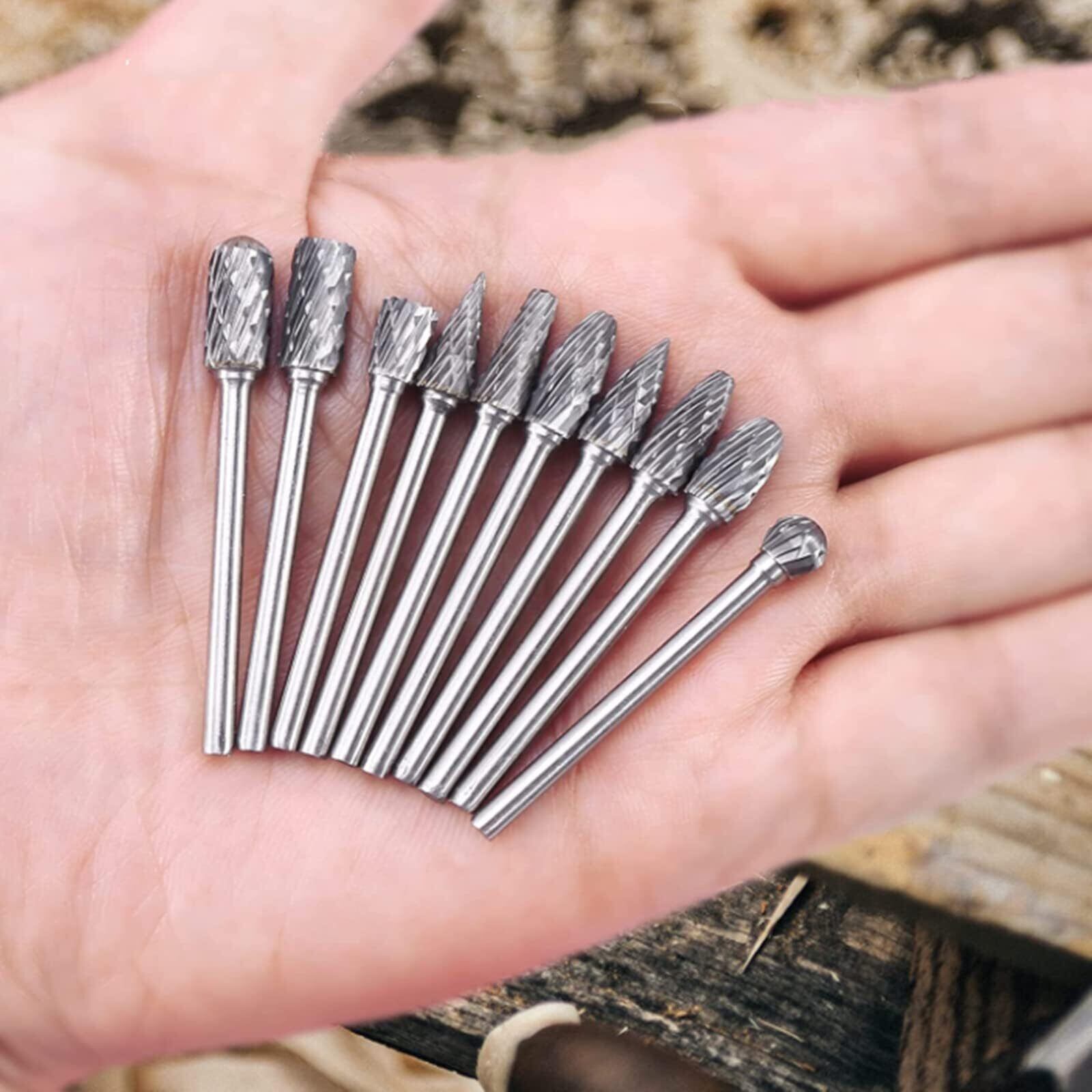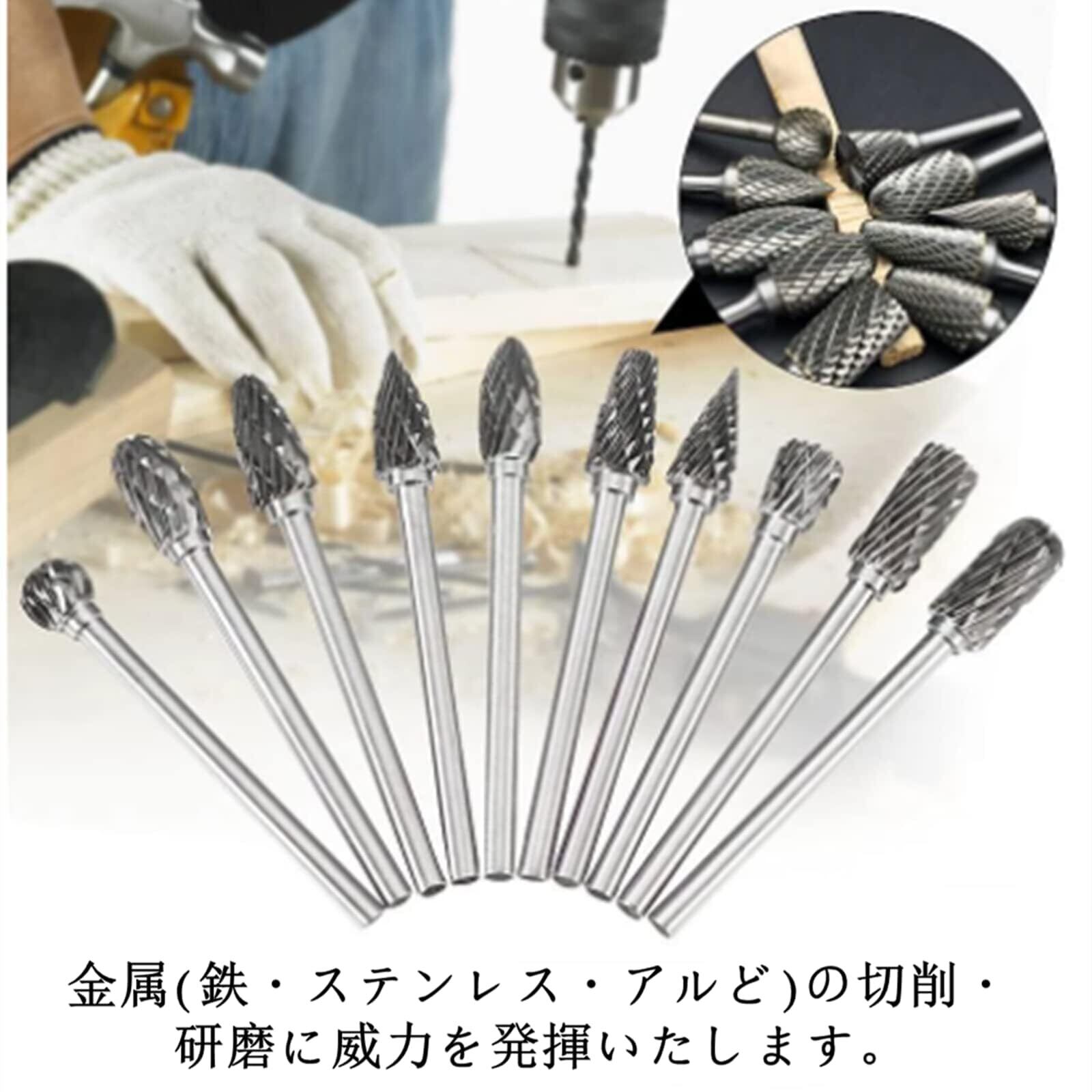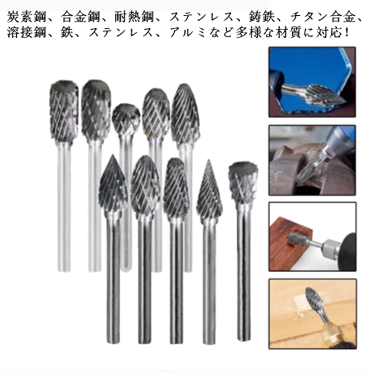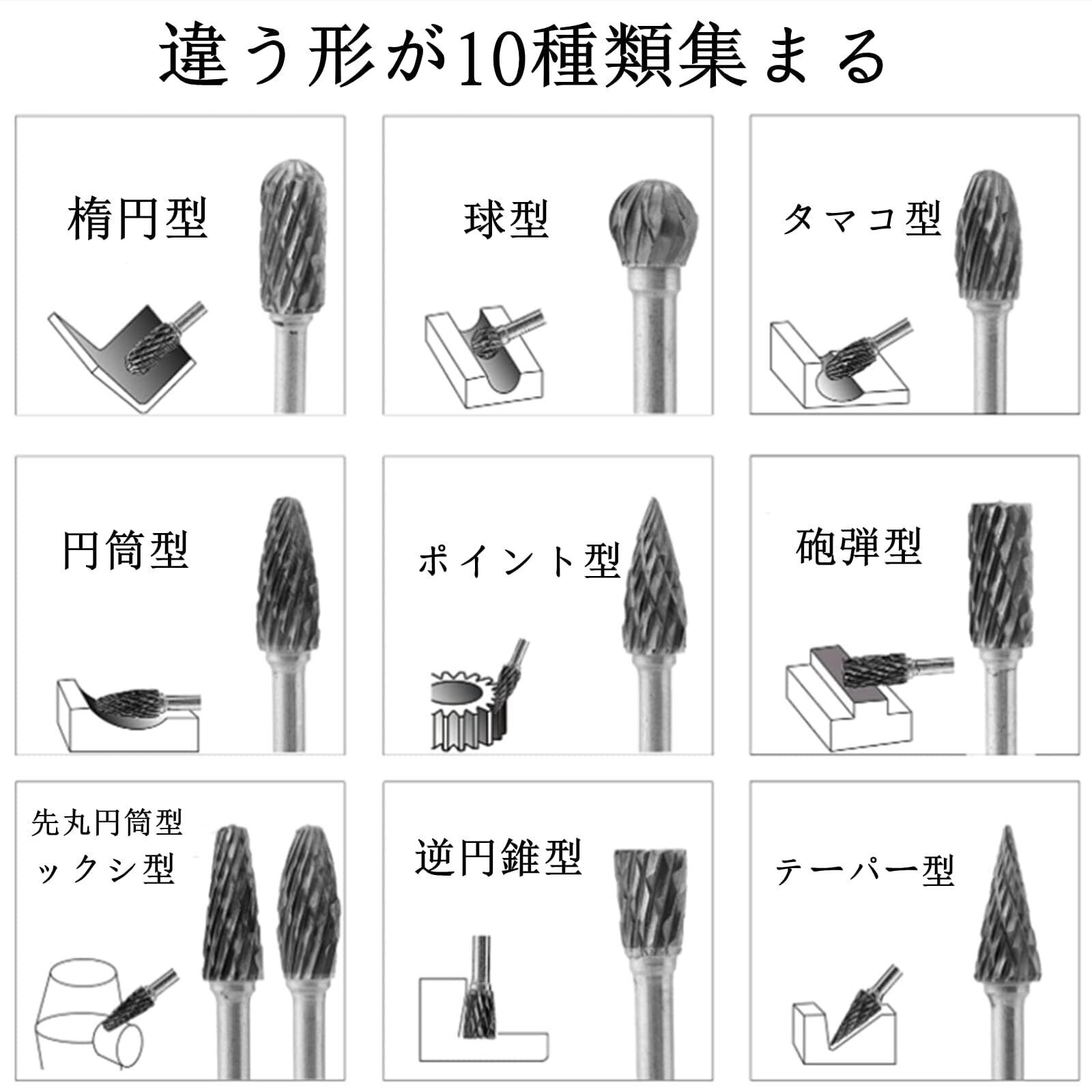 【商品内容】: サイズ:全長約40~50mm、シャンク径:3mm、ヘッド直径:6mm、材質:タングステン鋼。10種類、 ヘッド形状は、円筒型、先丸円筒型、球型、タマゴ型、砲弾型、ポイント型、楕円型、ツクシ型、テーパー型、逆円錐型、があり様々なご使用場面に応じて10種類のヘッドをお選びいただきます。
