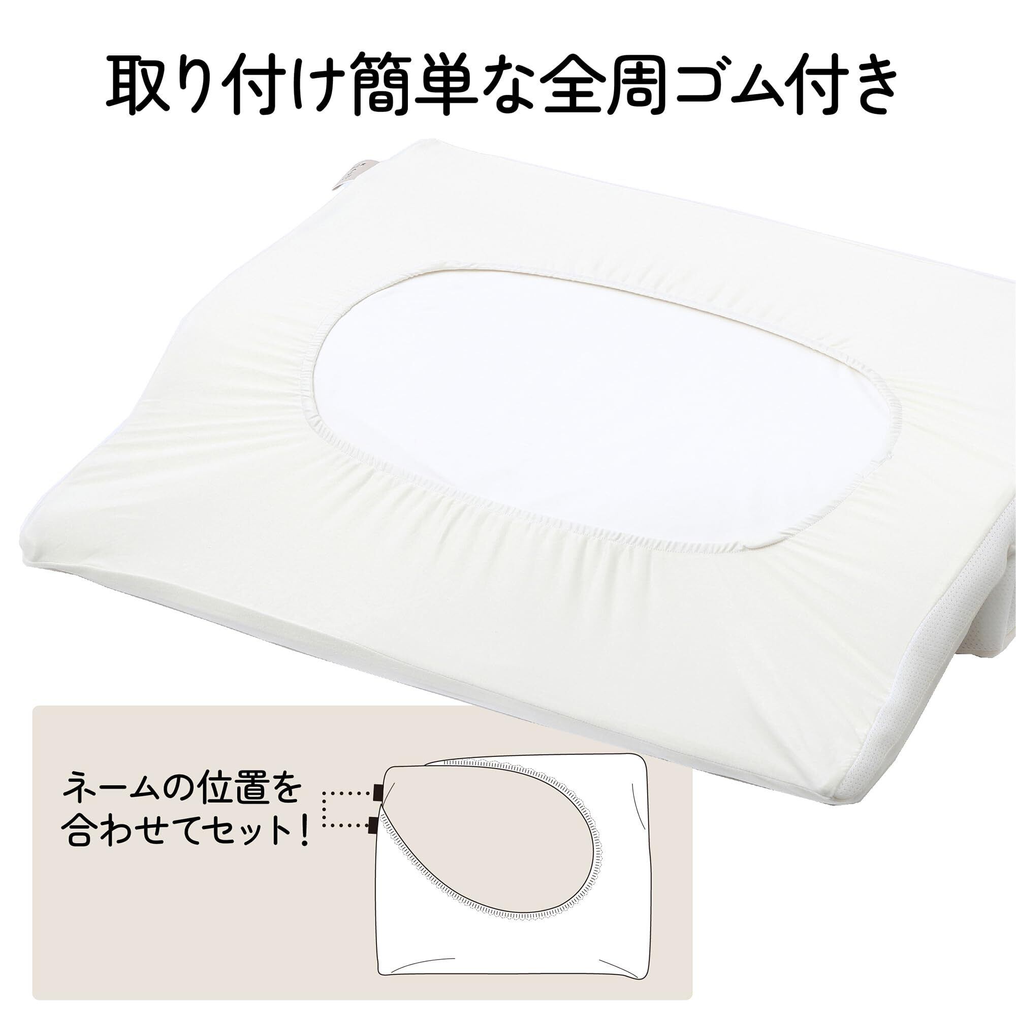 裏面に全周ゴムが付いているのでスポッとかぶせるだけで取り付け簡単。枕本体と枕カバーとに付いている【Soft】ネームの位置を合わせてセットしてください。