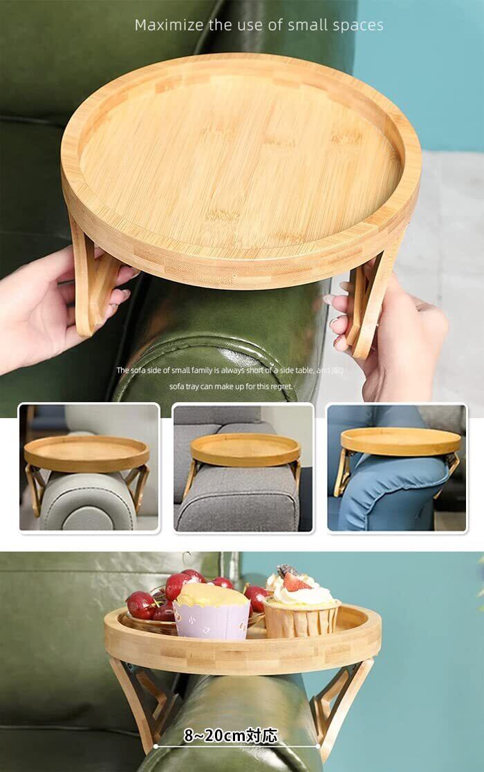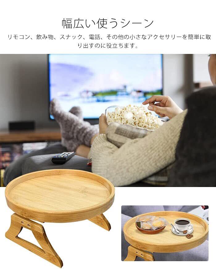 ソファアームレスト テーブル サイドテーブル 木製 ソファー肘掛用 クリップ式 カウチコースター 直径25cm リモコンラック ドリンクホルダー 小物 整理 収納 携帯電話 料理 メガネ ソファー (天然竹素材, 直径25cm)