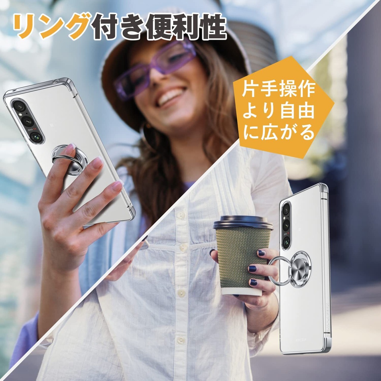 Xperia 10 V 用 ケース クリア リング付き エクスペリア 10 V/SO-52D / SOG11 カバー 透明 おしゃれ OURJOY スマホケース メッキ加工 ソフトケース 耐衝撃 軽量 薄型 ストラップホール付き スタンド機能 車載ホルダー対応 携帯ケース・シルバー