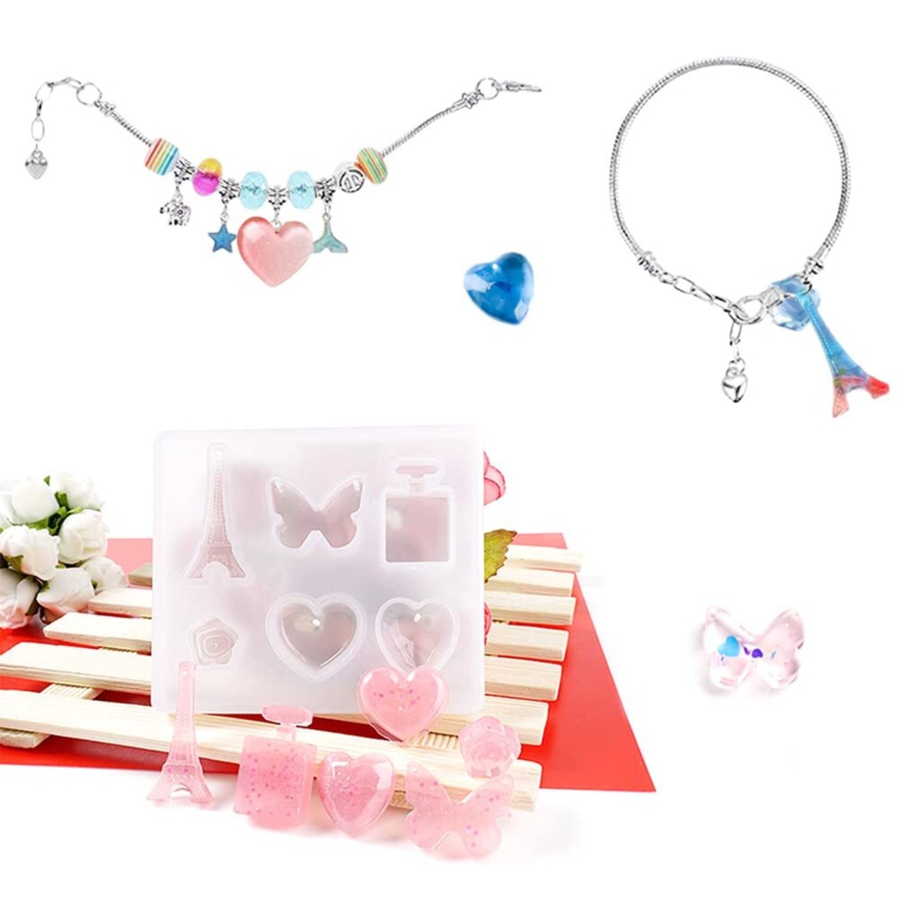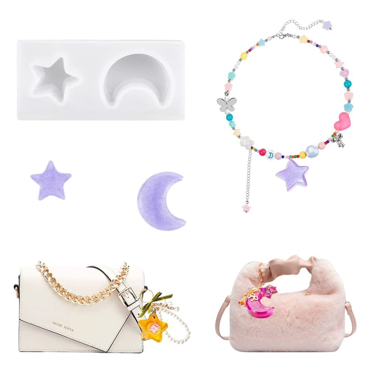 【多用途】4個のシリコンモールドでパーツを合計19種も作れ、一部は通し穴付きで、ネックレスのペンダント、ストラップなどのオリジナルの作品を製作することができます。