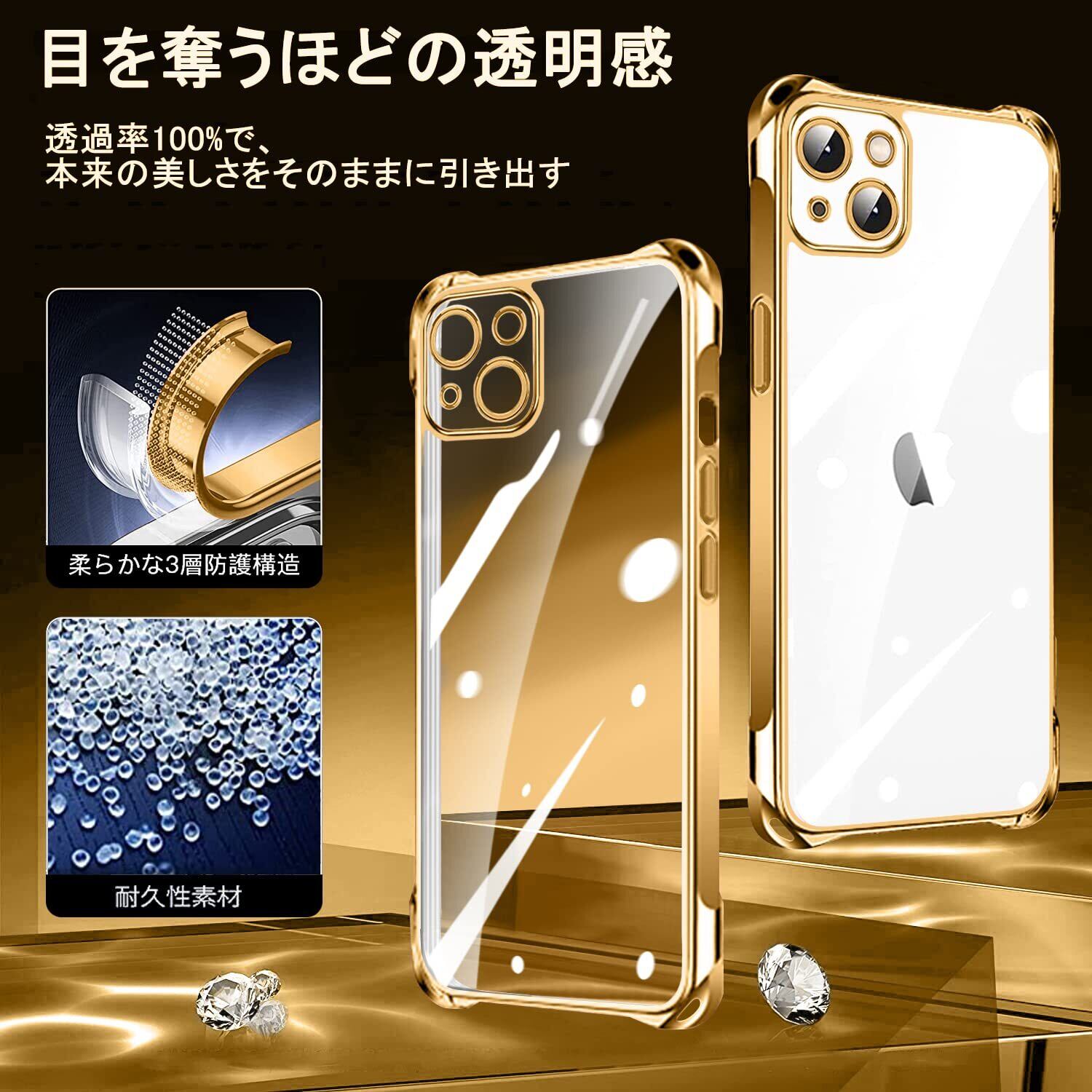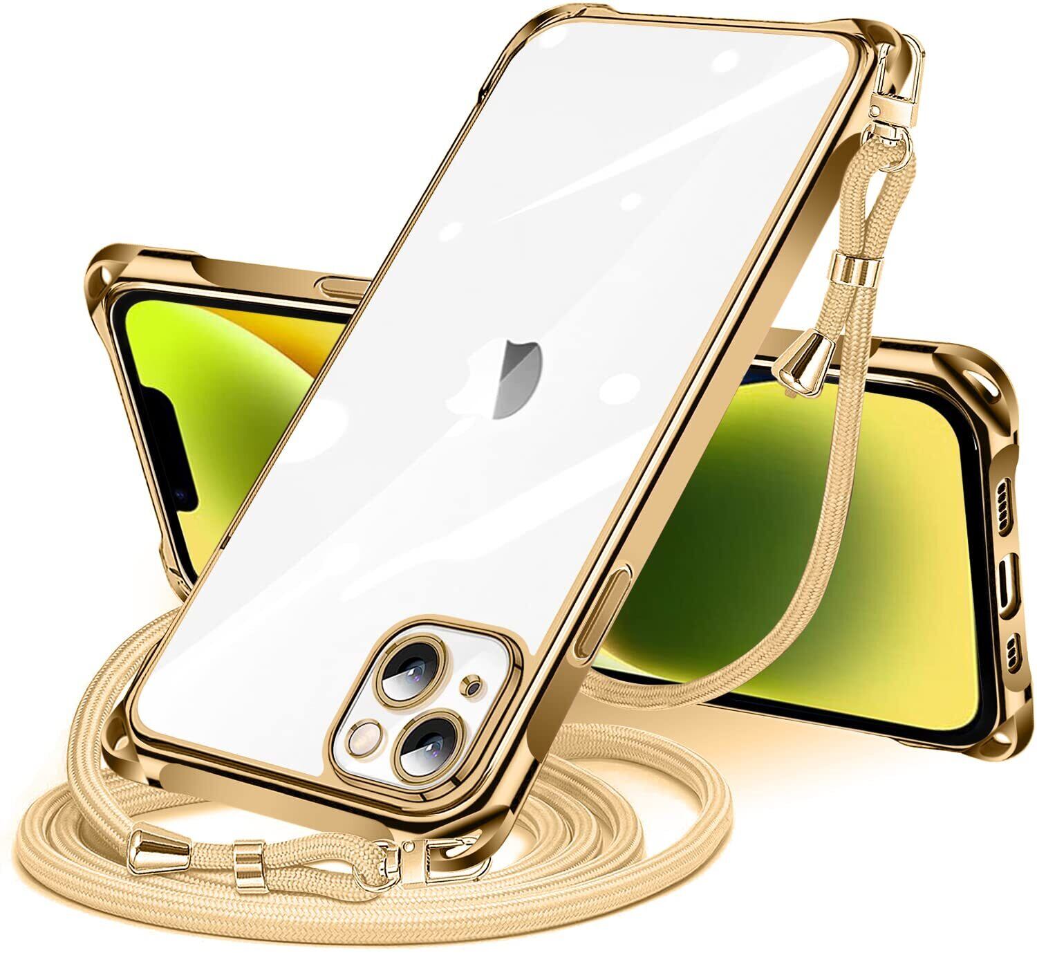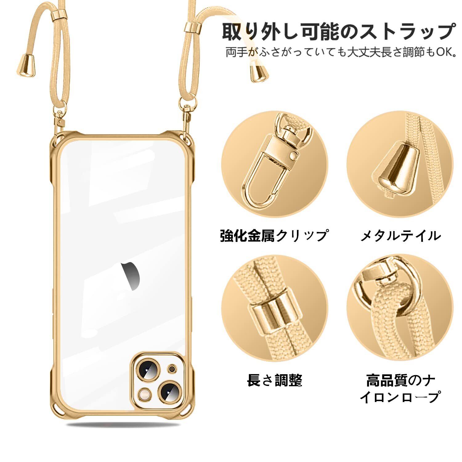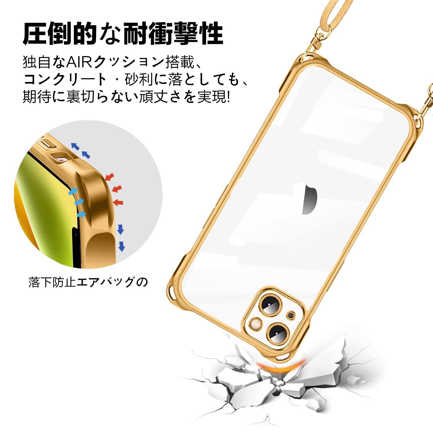 NISIILNG iPhone 13 用 ケース クリア ショルダー iphone13 スマホケース アイフォン13 カバー 肩掛け 斜めかけ 縄掛けケース 透明 TPU 薄型 軽量 耐衝撃 紐付き 斜めがけ 織りストラップ付き ネックストラップ ショルダー 縦/横 2WAY 長さ調整可能 取り外し可能 落下防止 紛失防止 (ゴールド)