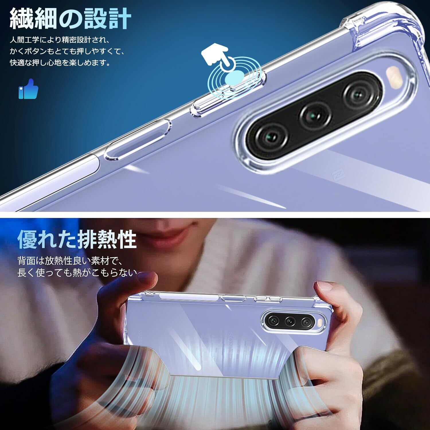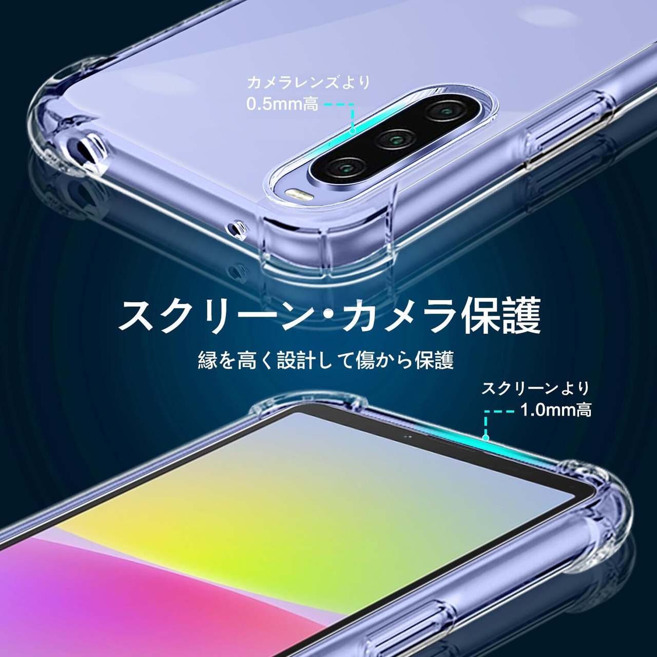 【衝撃吸収】四隅に施したエアクッションの加工で衝撃を吸収します。面と背面カメラ部のフチを高く設計し、液晶画面とカメラレンズをキズから保護します。 スマホを机などの平面に置いた場合に、液晶画面とカメラレンズが接触してできるキズが最小限に抑えられるよう、表側(液晶画面側)は1.0mmの、裏側(背面側)は0.5mmの高低差をつけ、ちゃんと携帯を保護することができます。