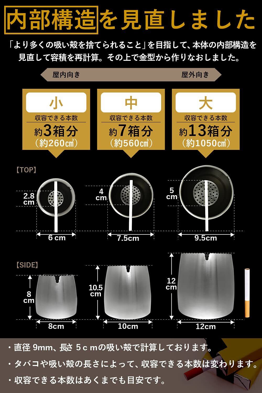 【選べる3つのサイズ】小サイズ-タバコ3箱分 直径8㎝・高さ8㎝ 中サイズ-タバコ7箱分 直径10㎝・高さ10㎝ 大サイズ-タバコ13箱分 直径12㎝・高さ12㎝ ※サイズについてはカタログの画像をご参照ください。 サイズが小さいものほど屋内使用向きで大きいものほど屋外使用向きです。 灰皿以外にも小物入れなどに活用できます。