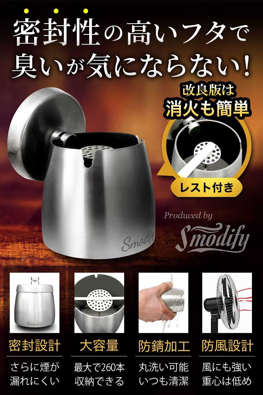 【愛煙家がこだわった蓋】高品質のステンレス素材を採用し、堅牢で密封性の高いフタで煙が漏れにくくなりました。また蓋と本体とのスキマをさらに縮めたことで、蓋の開閉時に生じる音も鳴りずらくなりました。ベランダでの喫煙でも防臭効果とあわせて近所の方を気にすることなく楽しめます。さらに蓋を自由に本体部分にかけていただくことが可能なので、外用として防風効果も期待できます。