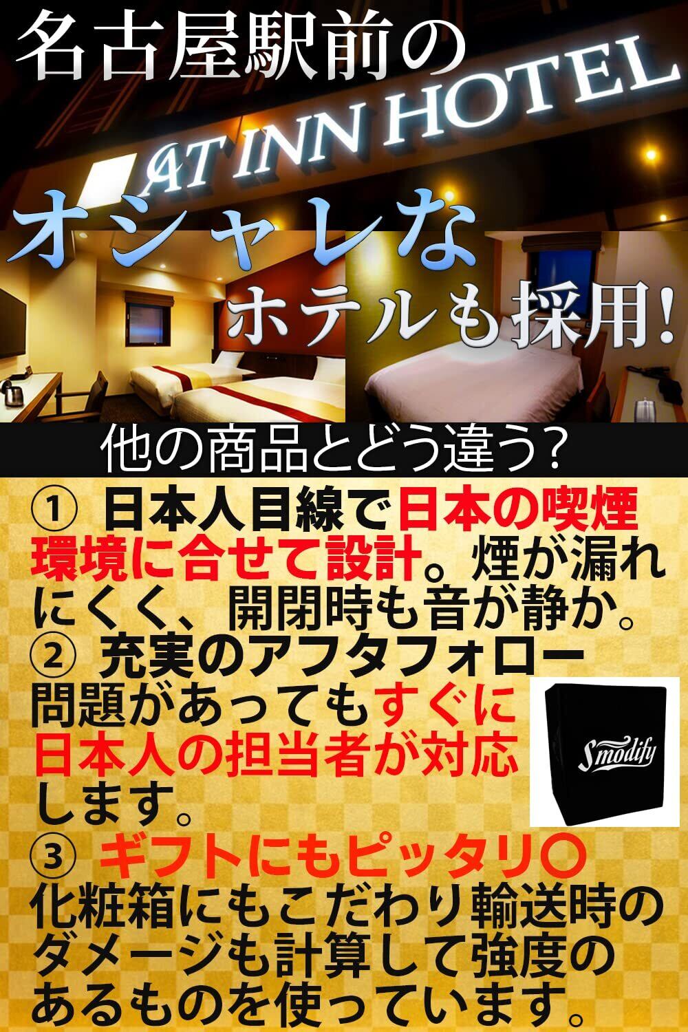【改良版火消し皿&タバコレスト付き】お客様からのご要望により、従来の火消し皿をもっと使い勝手をよくするために、独自で火消し皿に穴を開ける加工を施し、消火をかなり簡単にすることができました。(意匠登録済み)。また本体内部には吸いかけのタバコを置いておくレストがございます。消火時にはそちらのレストを使用して簡単に消火することが可能です。また本体部には3か所「U字」状のタバコかけ用の溝がありますのでタバコが転がってしまうこともなく置きやすいです。ショートサイズ6mmの細さのものにも対応し、太さ1cmを超えるシガーなどでも転がることなく喫煙していただくことが可能です。またiqosやglo、Ploomなど電子タバコの吸い殻ももちろんお使いいただけます。