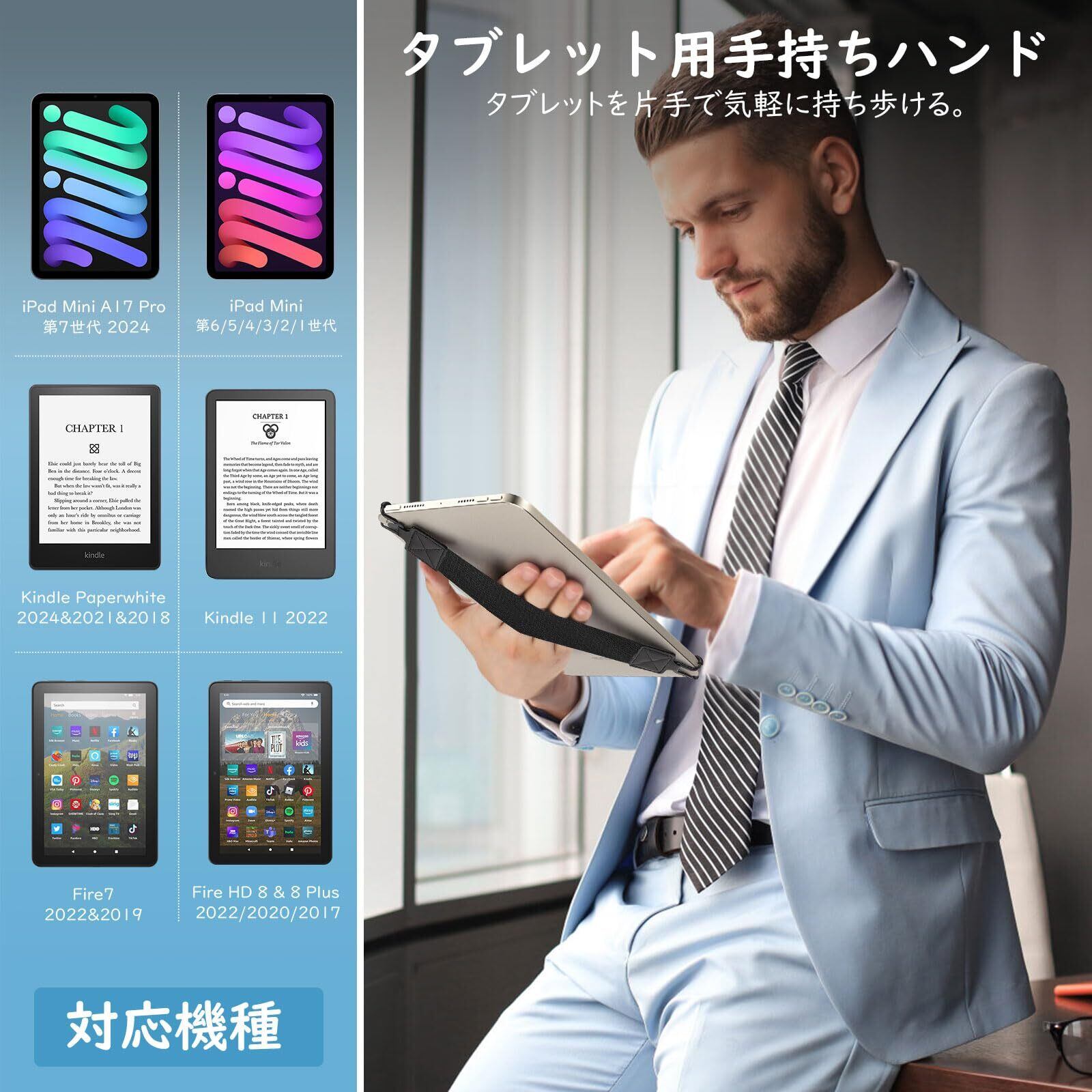 「対応機種」 伸縮性があるバンドを採用し、2024年新発売のiPad Mini A17 Pro、iPad Mini 第6/5/4/3/2/1世代、ペーパーホワイト 2024など6~8インチまでのタブレットに適用します。両端のフック+弾力バンドが伸ばされていない状態下の全長は約17CMになりますので、ご購入の前に、お手元の端末の寸法を予めご確認ください。
