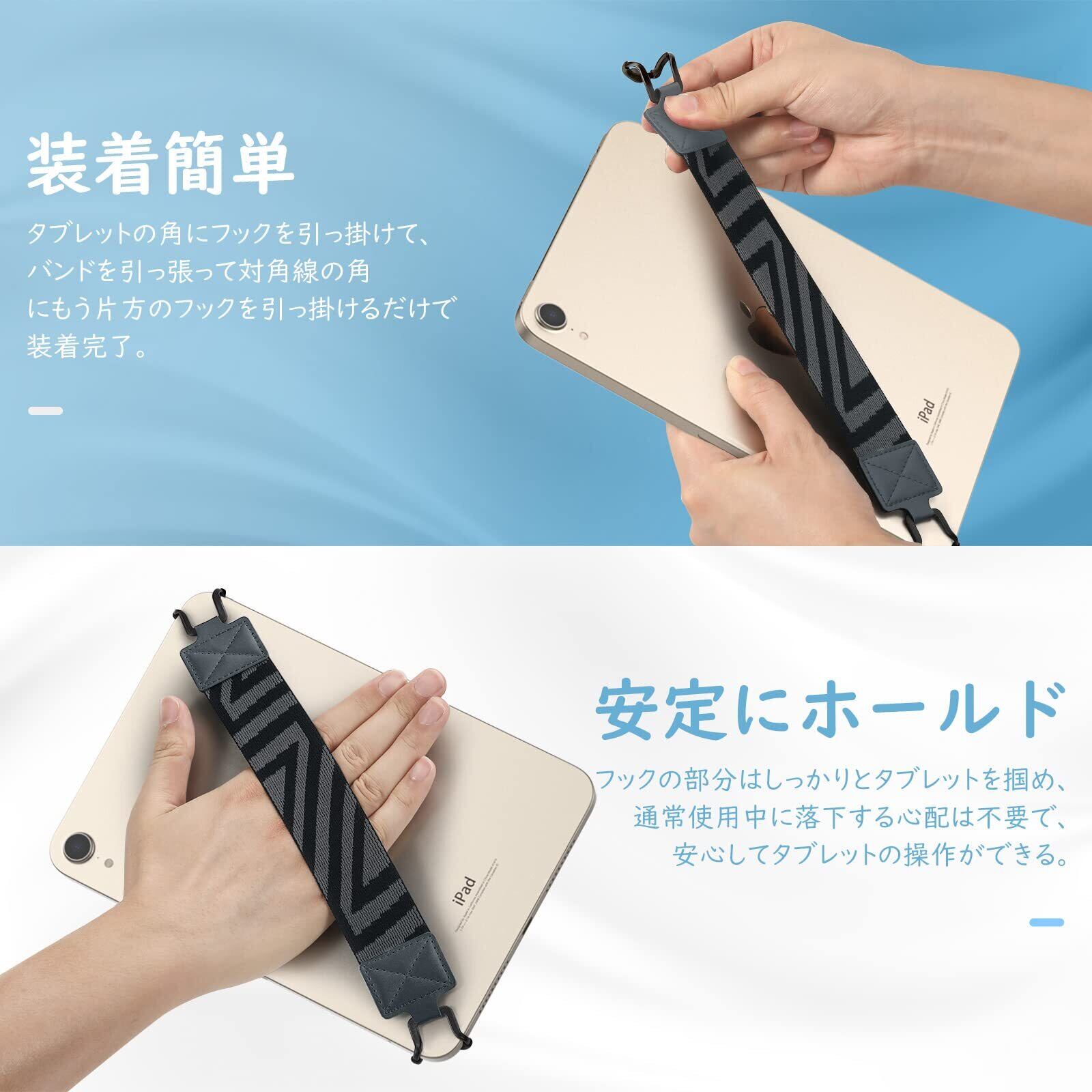 「最新の改良版」 使用方法は旧バージョンと同じく、タブレットの角にフックを引っ掛けて、バンドを引っ張って対角線の角にもう片方のフックを引っ掛けてもいいし、改良版のフックには摩擦力を強めたシリコンが追加され、斜めだけではなく、縦方向の使用も安心できます。軽くて簡単な構造の設計で、使わない時にはポケット、バッグなどに入れられ、お荷物の負担にならず、タブレットをそのまま使いたい方々にオススメです。